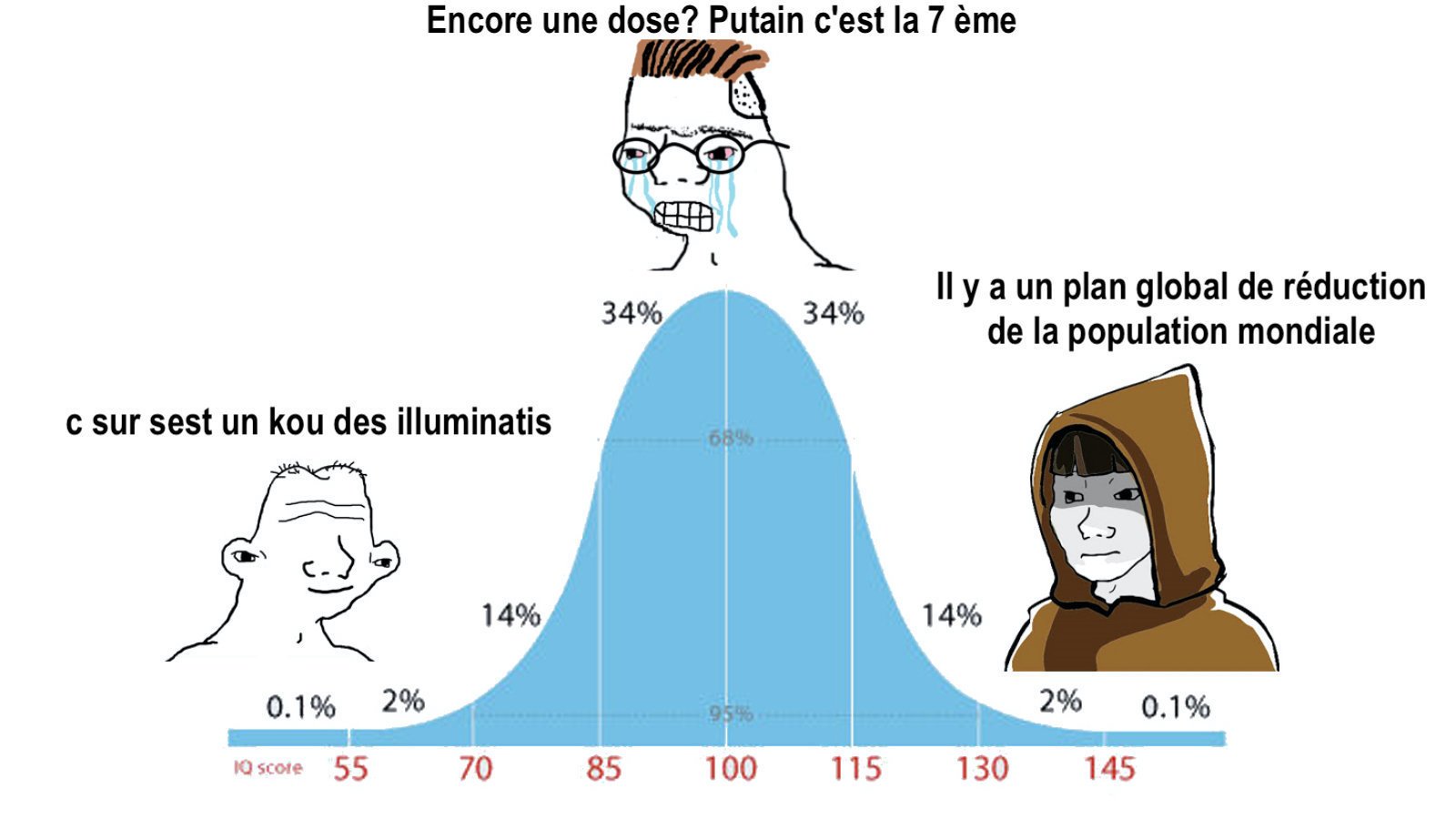 On voit bien ça ici aussi. Des low qui répandent la dernière théorie farfelue ou qui sont méfiant sans trop savoir argumenter et les high qui te pondent des giga pavés d'explications philosophiques, géopolitique et de raisonnement sans trop de propagande. Et puis il y a les pavés pro restrictions qui sont juste des condensés de régurgitations médiatique.
