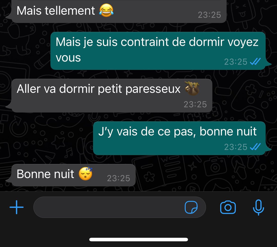 On a parlé pendant plus d’une heure de tout et de rien, elle faisait que relancer. Je précise que c’est une solide 8/10 qui m’a quitté assez rapidement. C’est quoi le projet ? Juste prendre des nouvelles ? S’assurer que je suis toujours là en secours ? Se rassurer sur son pouvoir de séduction ?