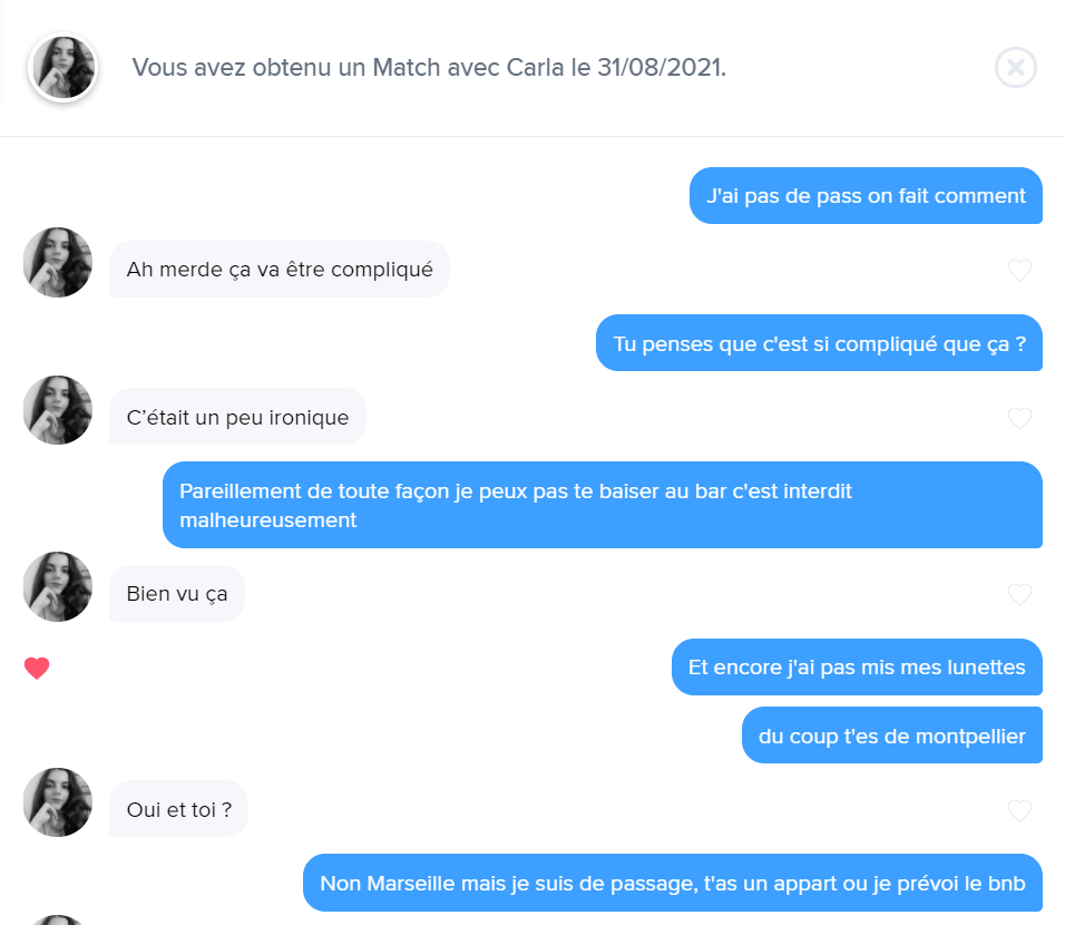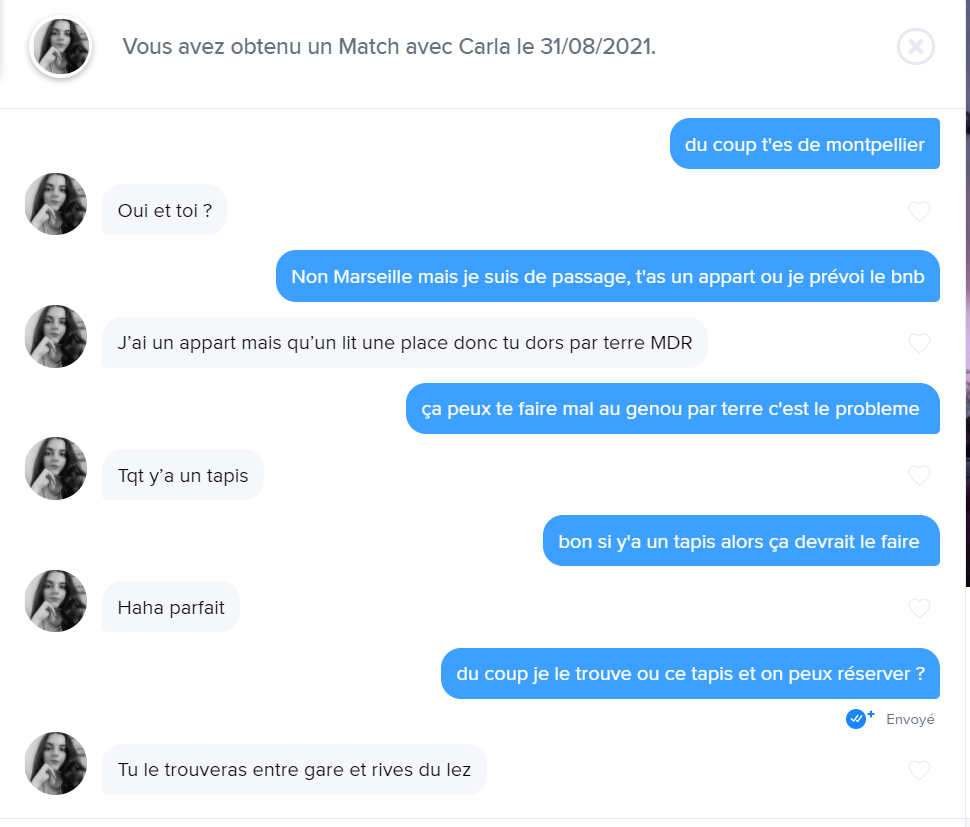 Le 31 août 2021 à 17:02:29 :Ca depend khey de l heure de la journée, du tinder platinium ou non