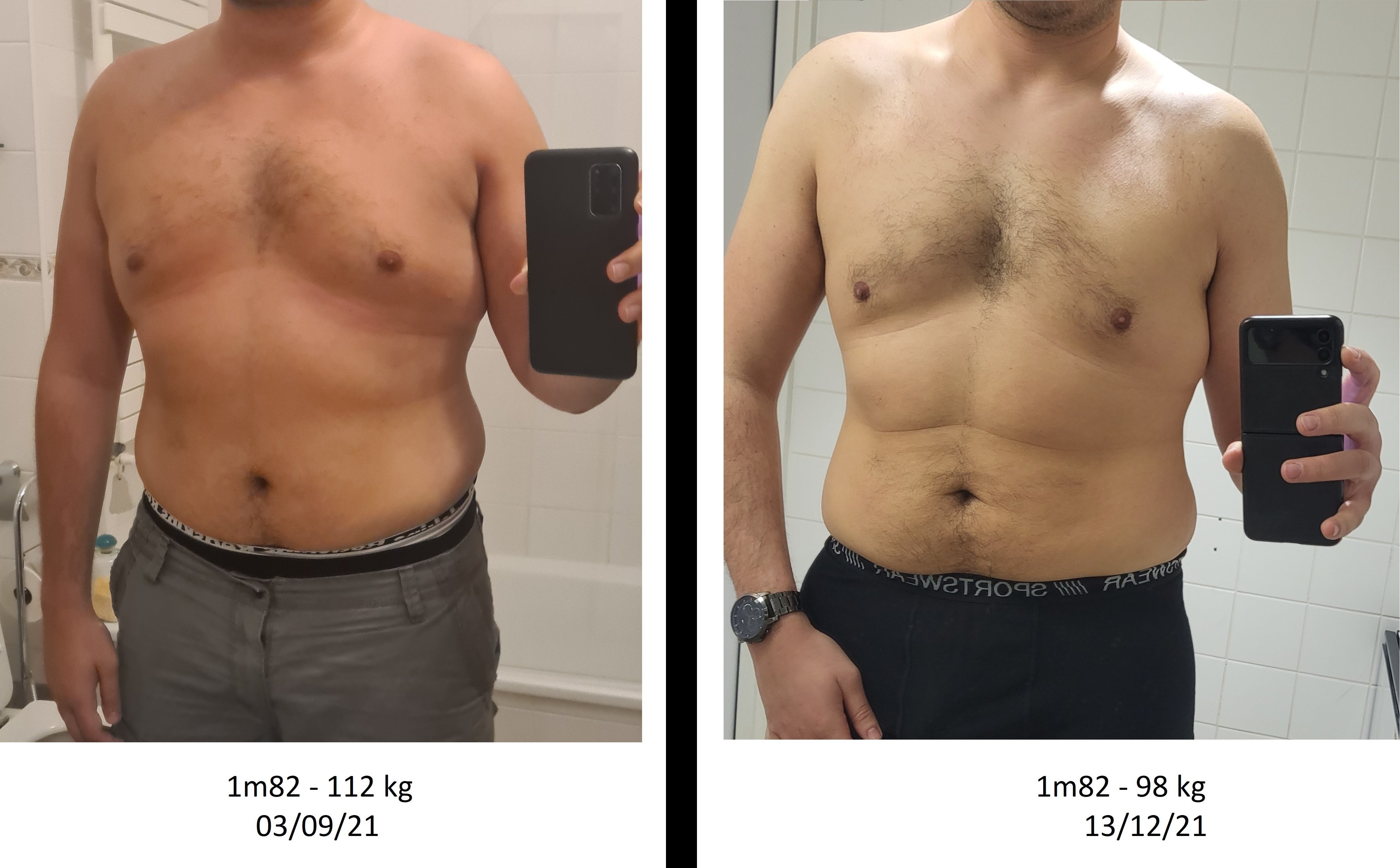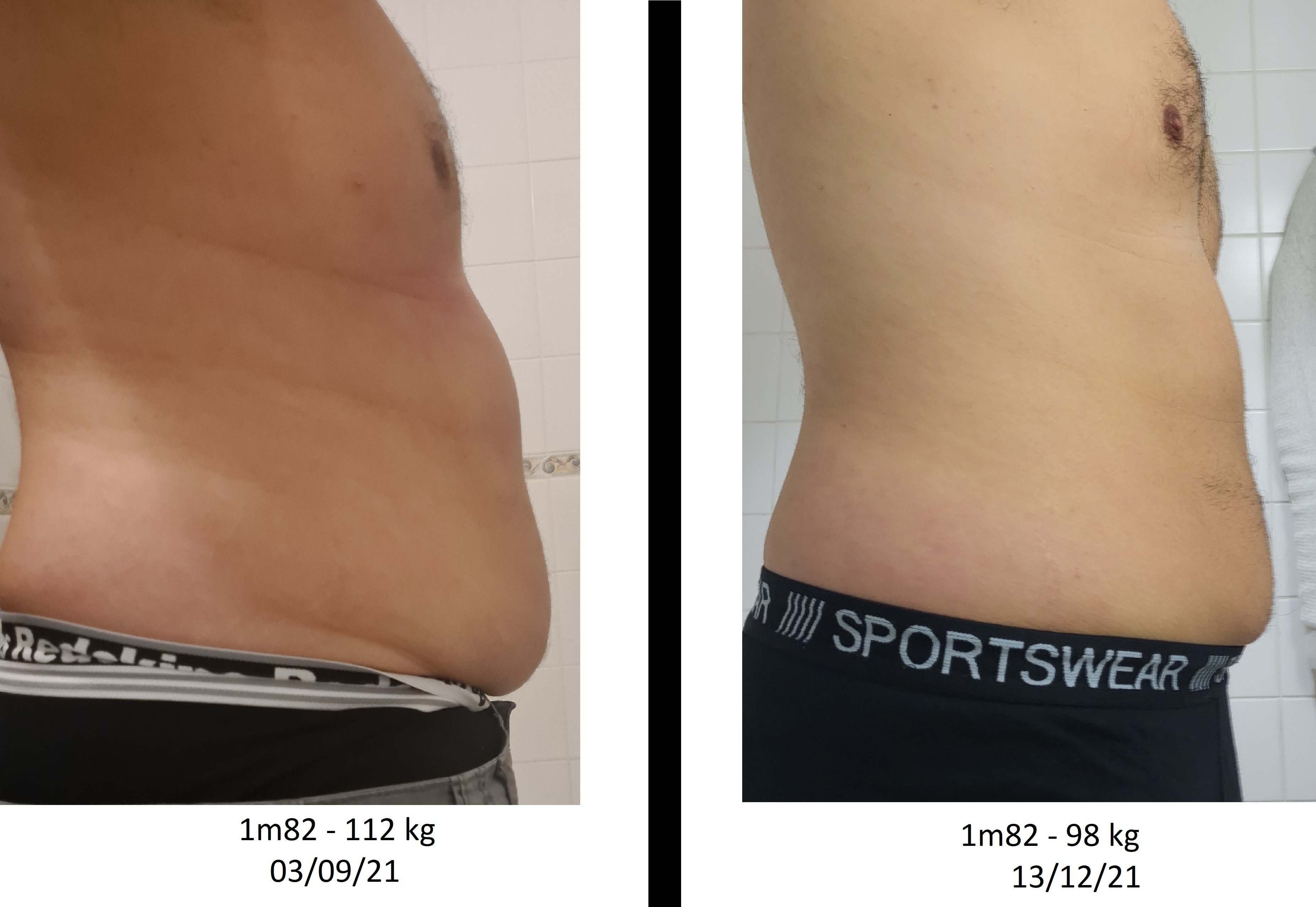 En terme de vêtement : je suis passé d'une taille 48 en pantalon à une taille 44 et d'une taille XL (parfois XXL) à une taille L pour le haut du corps
