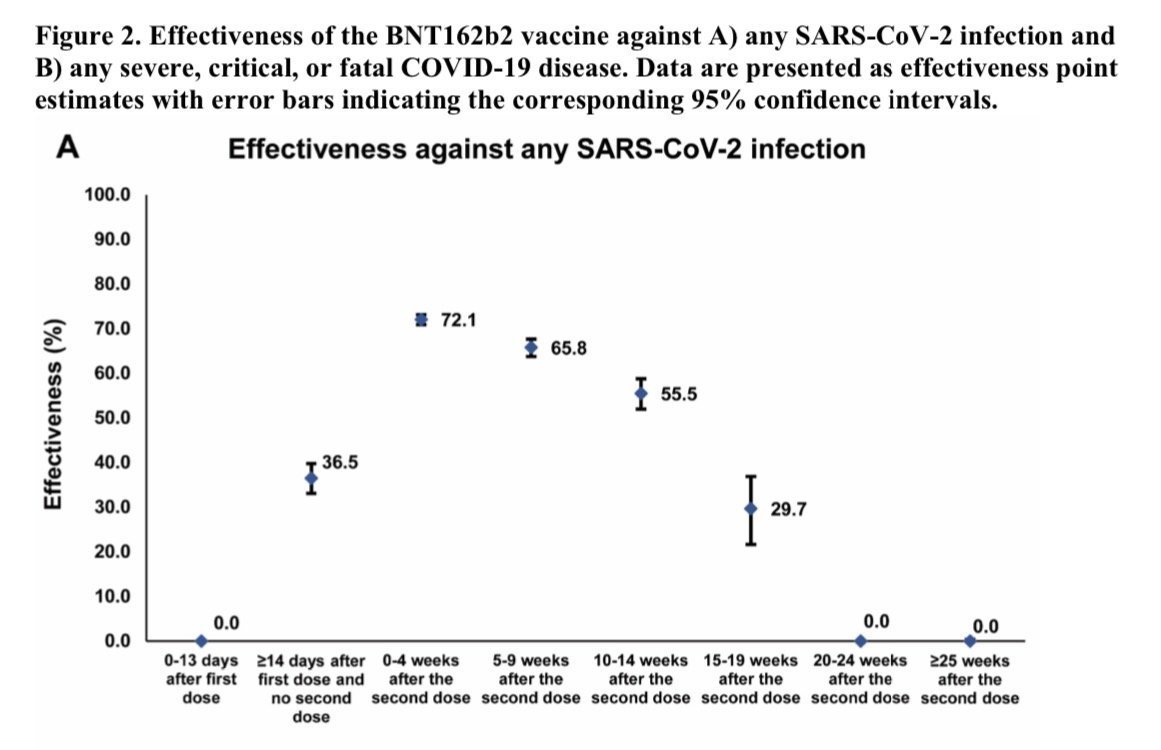 l'efficacité du vaccin commence au bout de 2 semaines à 36.5%, a un pic au bout de 4 semaines à 72,1%, puis décroit de semaine en semaine jusqu'à 0% d'efficacité à la 20ème semaine