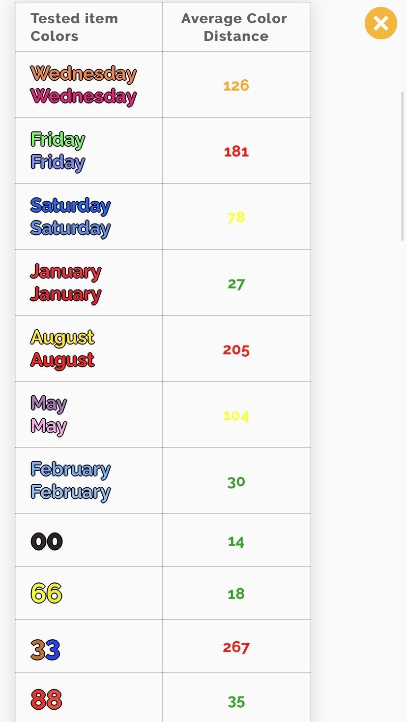 J'avais le même bleu pour Friday, mon association en tout cas je soupçonne que ça vienne du froid mais j'aurais aussi mis le mot Vendredi de la même couleur, donc va savoir. Saturday j'ai pris du noir probablement pour "Saturn Day" et t'as aussi une nuance très foncée ici, la plupart des mois de l'année sont de la même nuance plus ou moins donc je suppose que c'est une association groupée dans ton cas, le 0 la plupart des gens le mettent blanc je pense, le reste c'est assez éloigné de mes couleurs en gen donc je vois pas spontanément de pattern