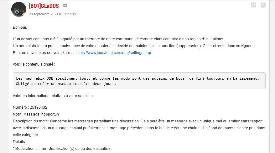 Un administrateur a pris connaissance de votre dossier et a décidé de maintenir cette sanction (bannissement temporaire (15 jour(s))). Celle-ci reste donc en vigueur.