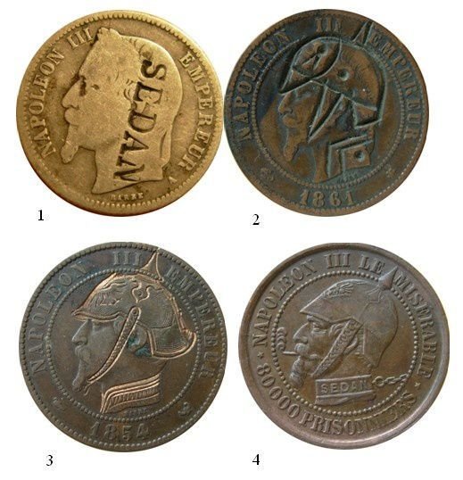 -Les contremarques , certaines monnaies qui etaient à l'effigie d'un personnage du gouvernement on reçus des contremarques amateurs ou professionnelles afin de dénigrer le personnage de l'époque ici napoleon 3 aprés sa défaite de la bataille de sedan :