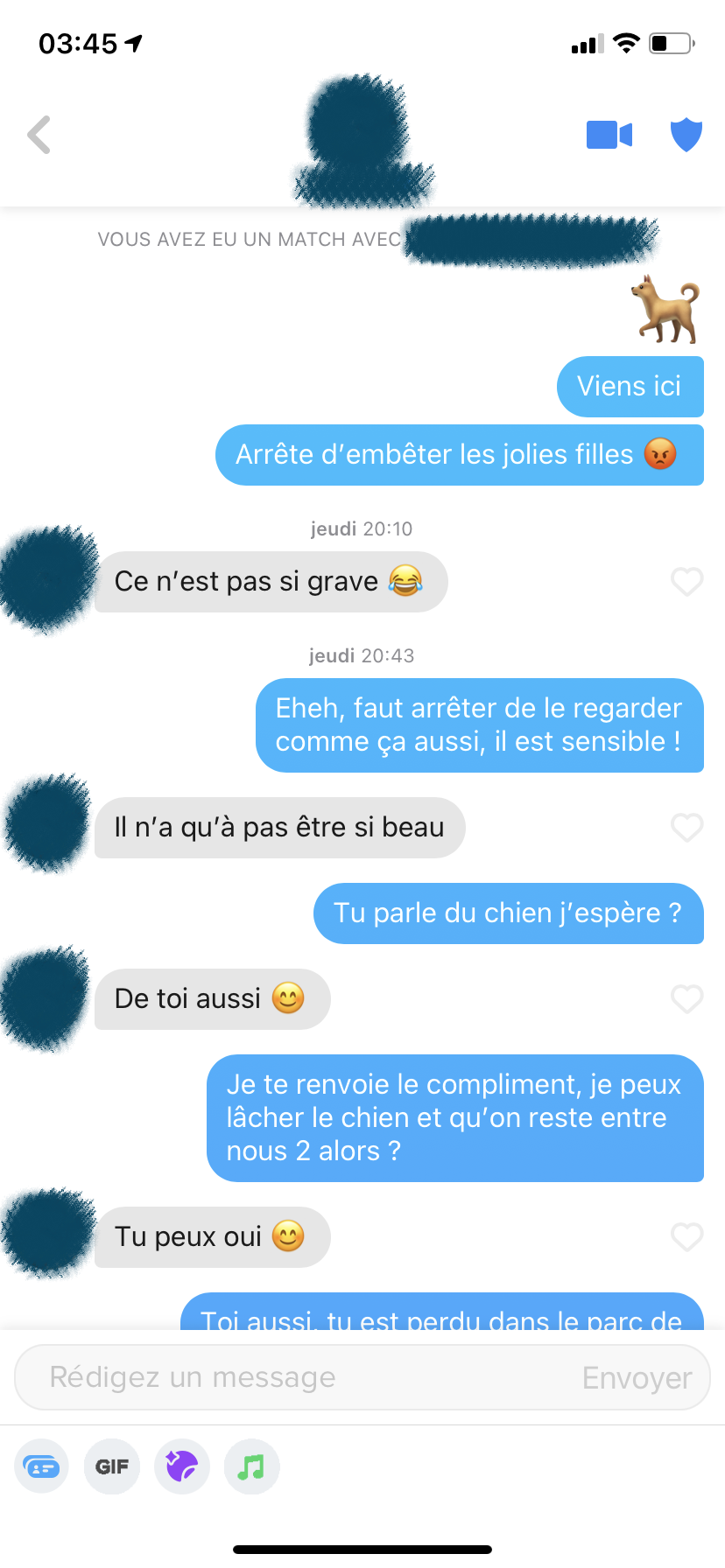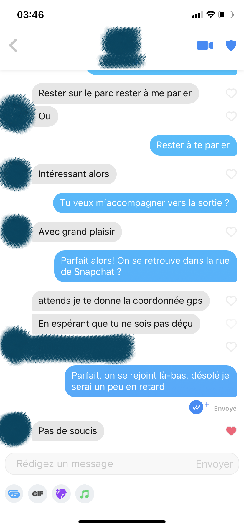 Légèrement malaisant. De plus je n'ai pas compris ce que tu appelles technique.La façon de détourner la conversation pour avoir son snap sans forcer parler en audio directement khey, après tu fais la taff dessus
