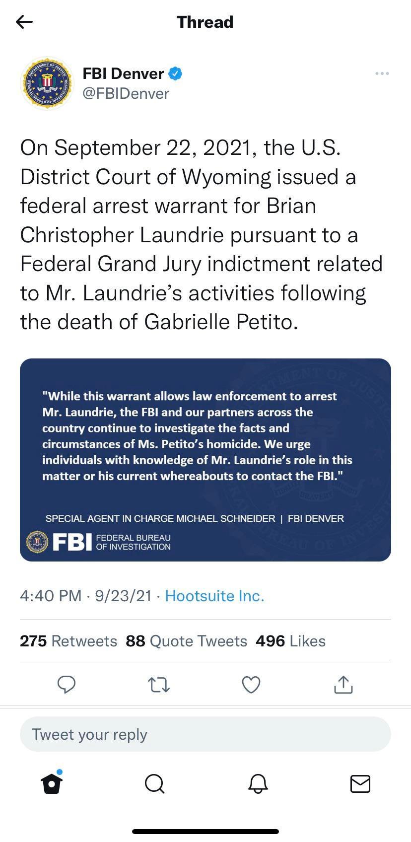[Gabby Petito] Mandat d'arrêt émis contre Brian Laundrie