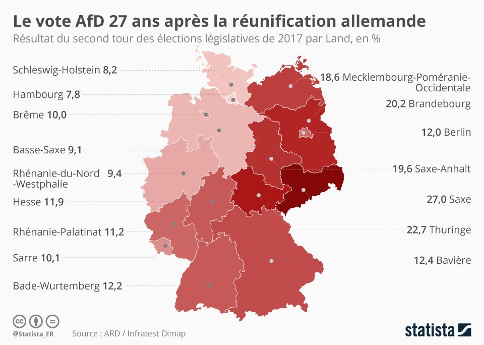 Voici trois cartes qui vous permettront de comprendre autour de quel prisme se construit ou se déconstruit le vote de l'extrême-droite allemande :
