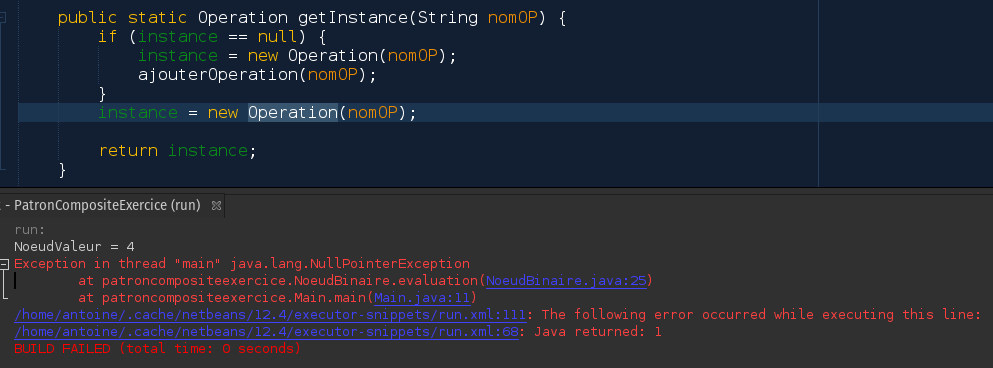 </code>package com.company; public class Main { public static void main(String[] args) { // write your code here OperationNode operationNode1 = new OperationNode( "+", new OperationNode(10), new OperationNode(2) ); OperationNode operationNode2 = new OperationNode("/", operationNode1, new OperationNode(6)); System.out.println(operationNode2.getResult()); } }Le singleton ne sert à rien. Une sorte d'arbre binaire qui a soit une operation soit un nombre parait beaucoup plus simples. Une classe suffit pour ça, et très peu de code