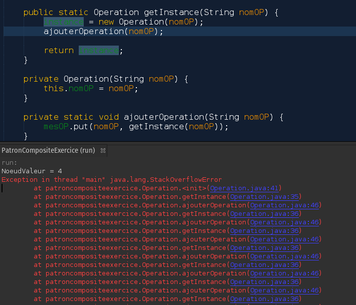 Là j'ai une boucle StackOverflowIl faudrait remettre le instancce == null car en cours on a appris à écrire comme ça les singletons