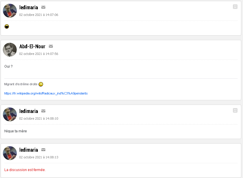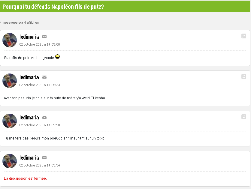 Le 02 octobre 2021 à 14:21:36 :Si c’est privé règle tes problèmes en privéSinon coupe internet si tu as pas les épaules