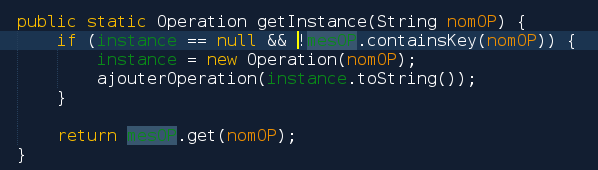 public static Operation getInstance(String nomOP) { if (!mesOP.containsKey(nomOP)) { final Operation newOp = new Operation(nomOP); ajouterOperation(newOp ); } return mesOP.get(nomOP); }De telle manière ?