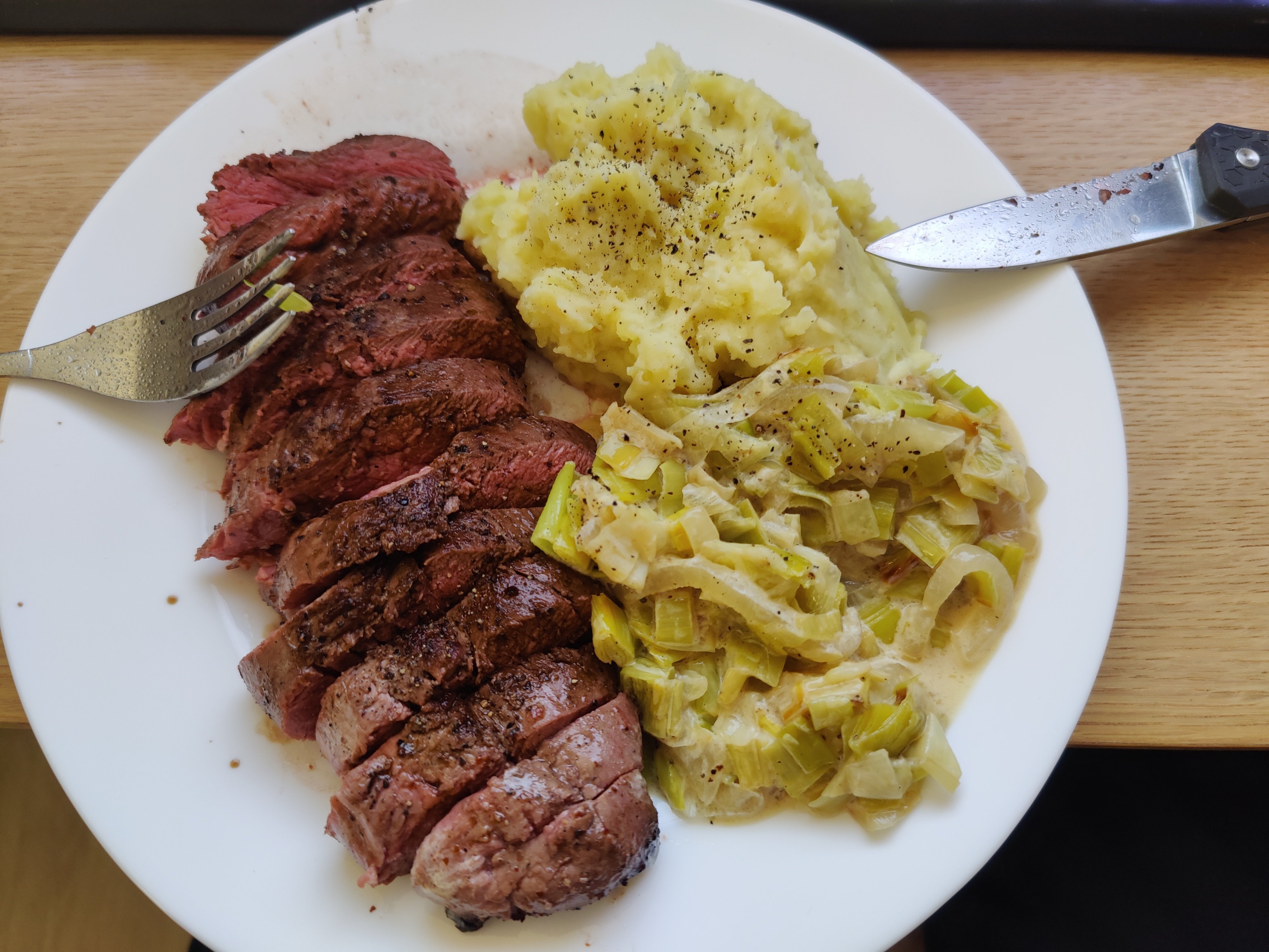 Fondue de poireaux avec crème et un peu de sauce soja sucrée. Magret de canard cuit comme j'aime.Ecrasé de pommes de terre.