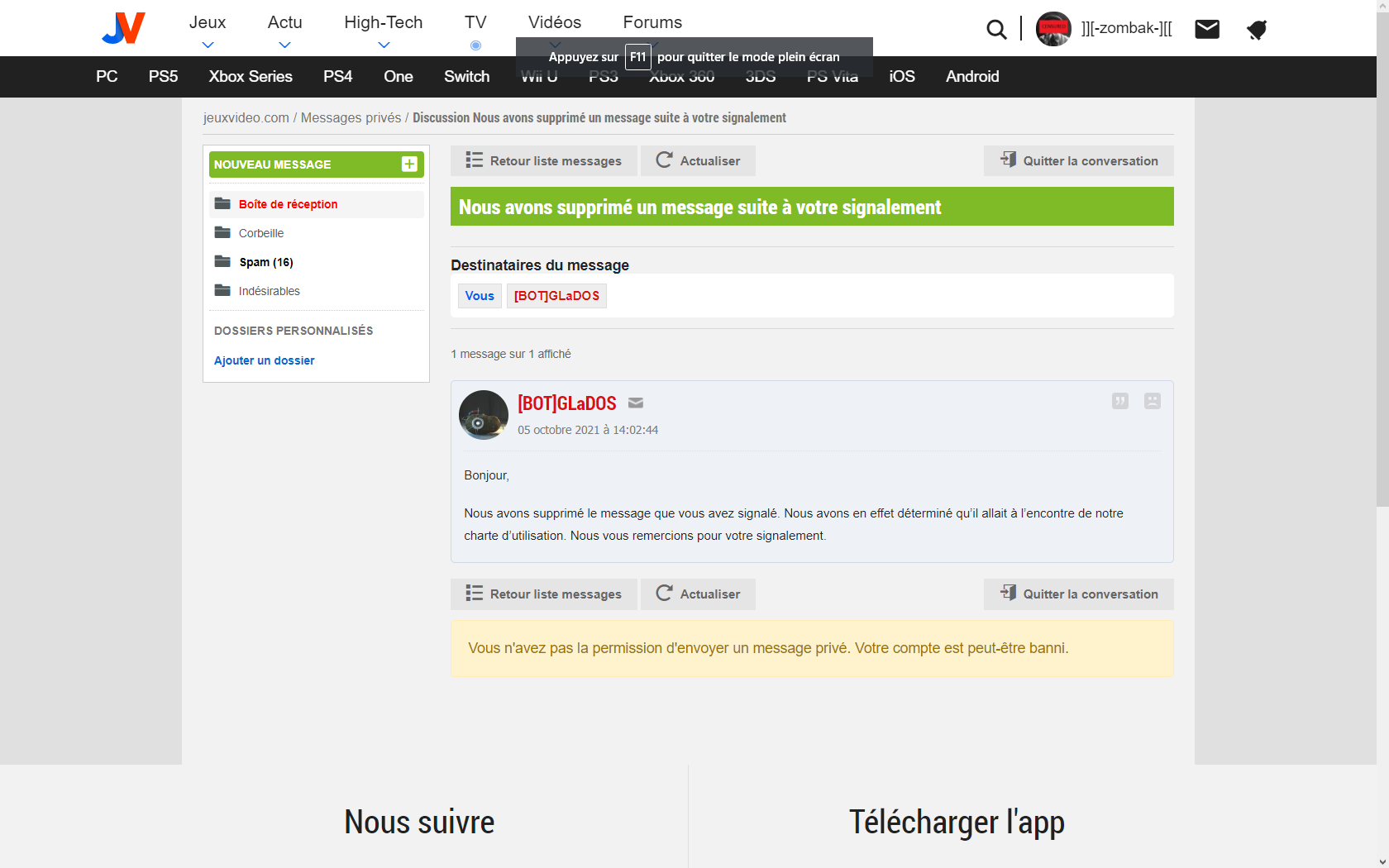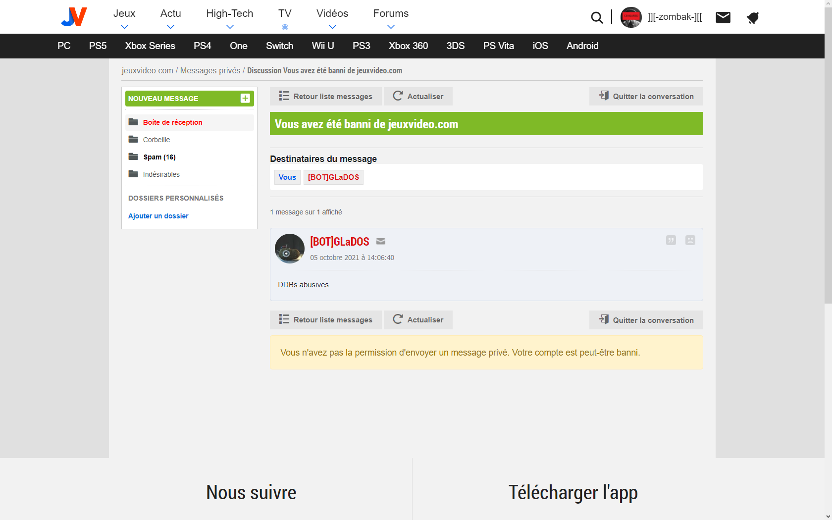 Tous les deux bans par le bot mais lui a fait une réclamation. Laisse le tranquille stpTu remarquera que je ne peux pas en faire dans le MP de glados que j'ai reçu pour mon ban