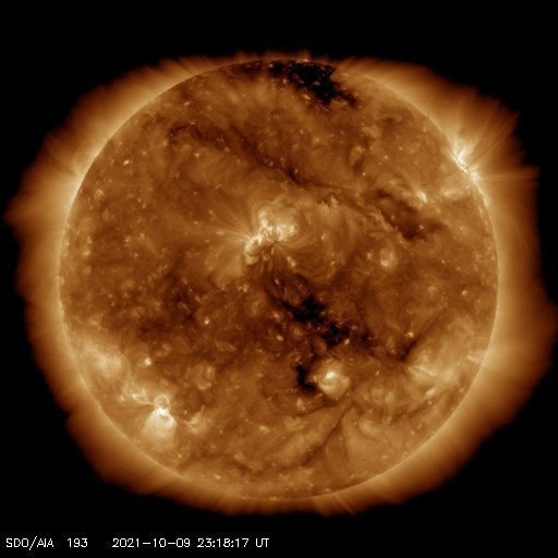 A southern hemisphere coronal hole is facing Earth. Enhanced solar wind could arrive in ~3 days - Follow live on https://spaceweather.live/l/ch Source : https://mobile.twitter.com/_SpaceWeather_/status/1446890775455969285