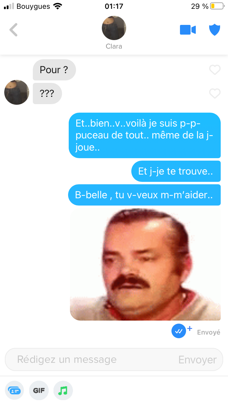 Tu as quel âge ? Dans ton cas, Tinder c'est next oui. Cependant, non, c'est pas tant le malaise que ça si tu es en confiance et bien avec ta conquête. Le plus safe dans une situation comme la tienne, c'est le couple. Mais pour ça, il faudra gagner du skill social dans tous les cas