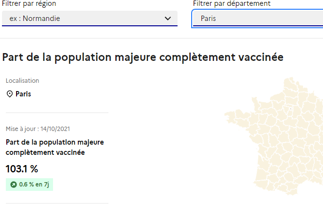 Le chiffre représente le nombre de personnes qui se sont vacciner à Paris, divisé par le nombre d'habitants à ParisIl suffit donc de venir d'une autre ville se faire vacciner à Paris pour gonfler les chiffres de Paris
