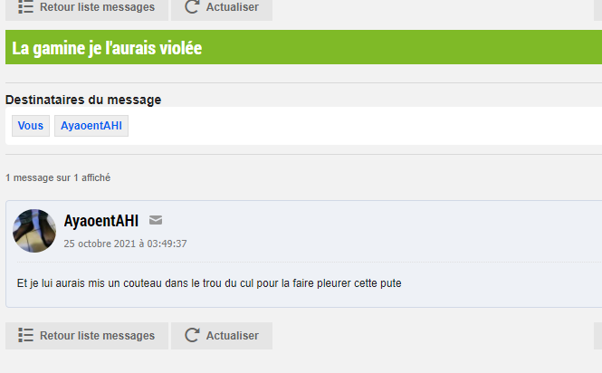 J'espère que tu vas prendre cher a l'hôpital psychiatrique pour avoir fait pleurer ta mère en vidéo et pour avoir envie de coucher avec des gosses