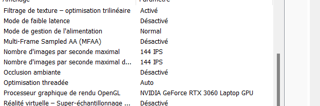 Bah t'as pas l'air d'avoir touché à la VSync (je ne la vois pas sur le screen car elle est plus bas) mais t'as mis un max de 144, pourquoi pas, à tester de toute façon. Perso j'aime pas le VSync, ça rajoute de la latence et sur un jeu de tir, bof. Y a rien dans les paramètres du jeu ? Moi quand je peux passer par le jeu je passe par le jeu.