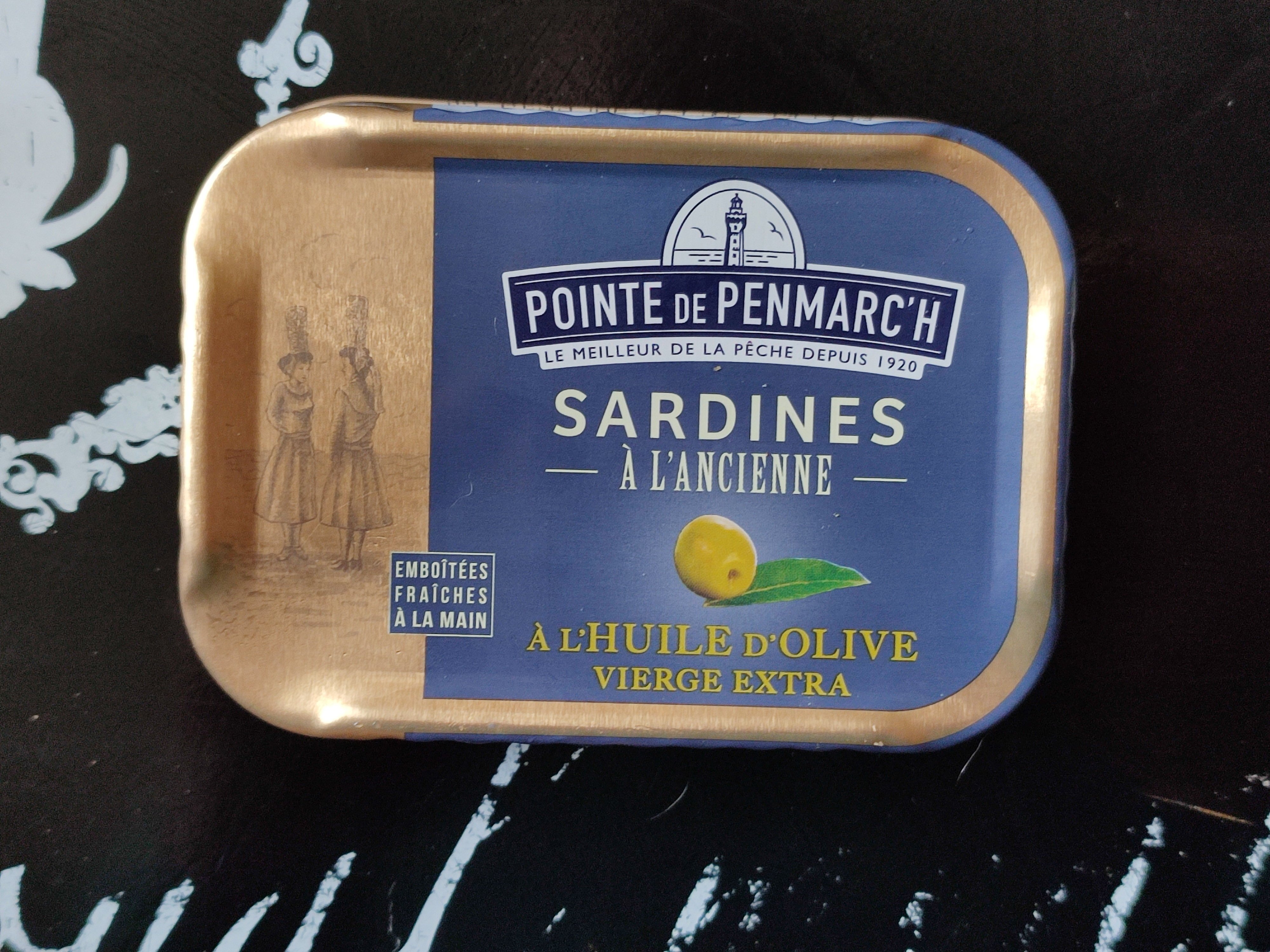 Ce midi, dégustation de Sardines à l'ancienne à l'huile d'olive vierge extra de la marque Pointe de Penmarc'h, date limite 09/2022, prix 5.90€ en épicerie fine.
