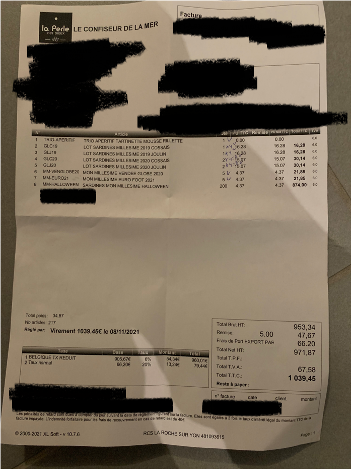 donc pour 217 sardines (colis de 34.87kg), j'ai dû payer 1039,45€