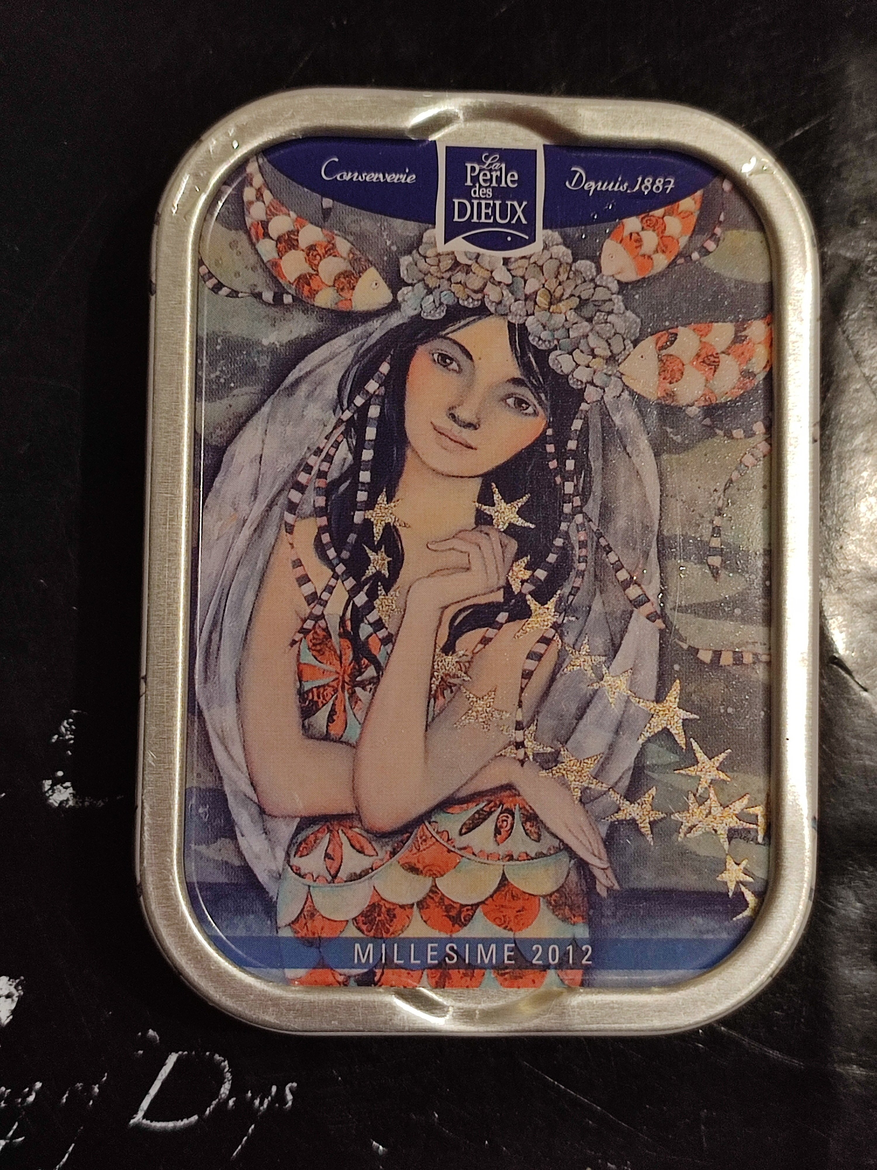 Ce soir, dégustation de Sardines Millésimées 2012 Delphine Cossais « Mlle Perle, pour la vie... » de la marque La Perle des Dieux, date limite 07/2022, trouvées sur Leboncoin :