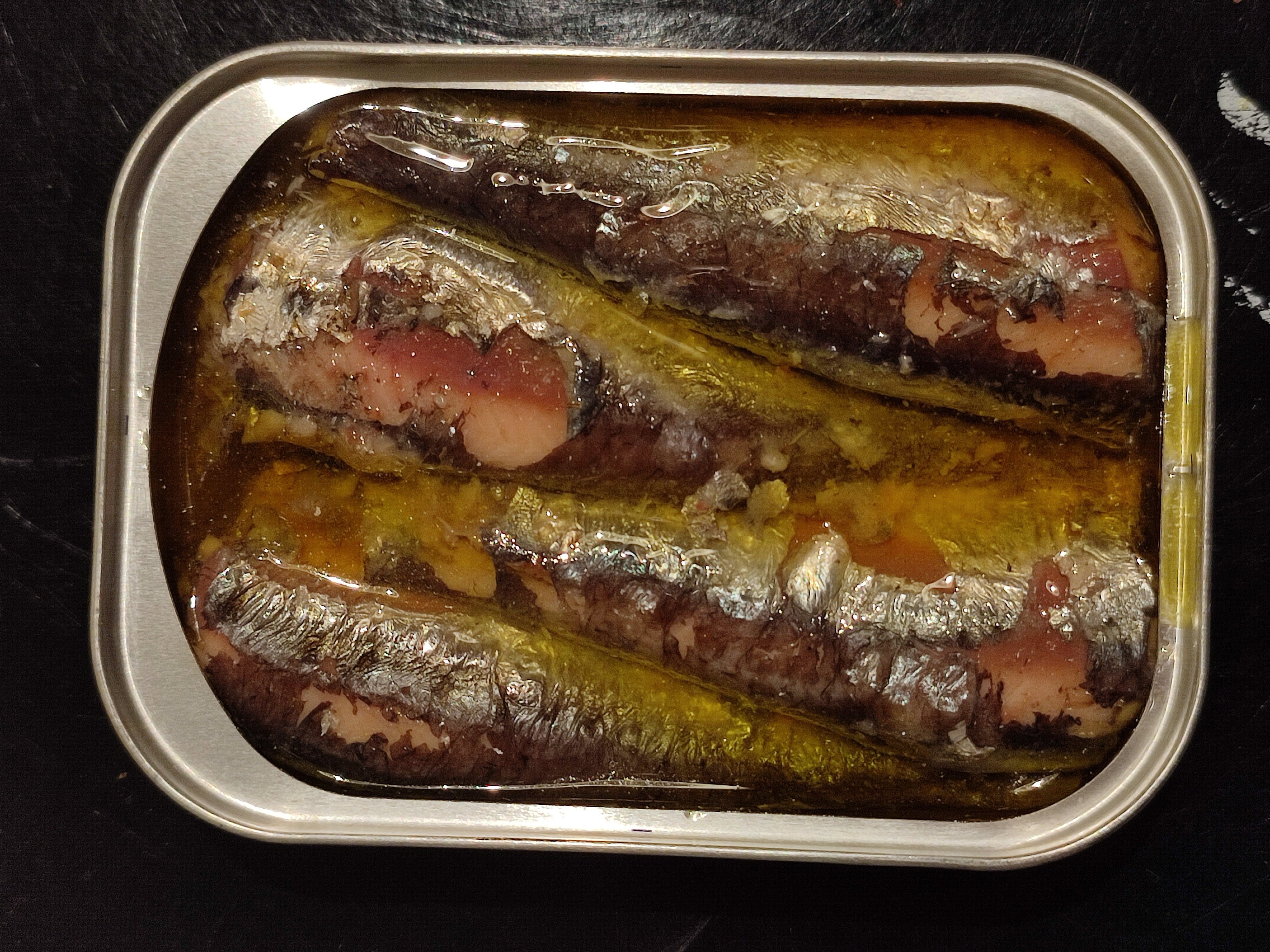 A l'ouverture de la boite, outre l'agréable (et puissante !) odeur de sardine, on trouve 4 belles sardines bien rangées dont la peau s'est pas mal délitée, signe normal de vieillissement.