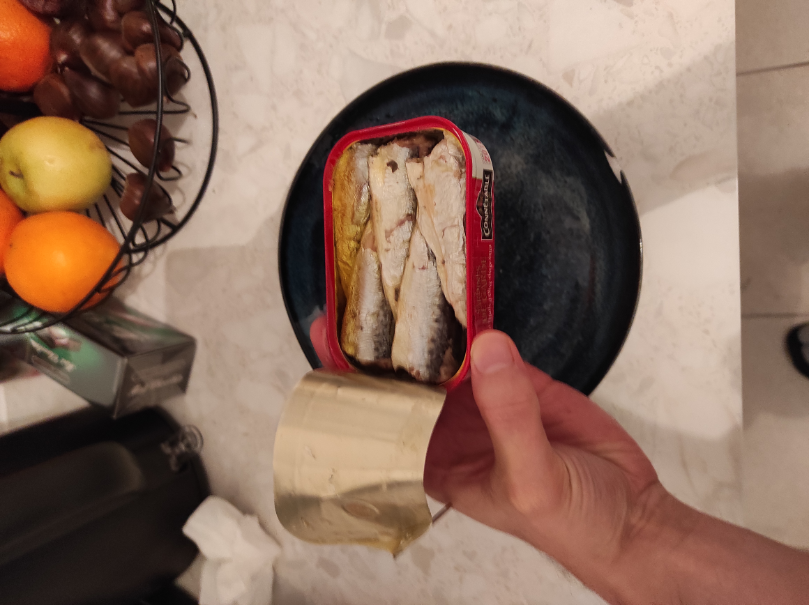 Je me lance aussi dans le sardine game. Un 31/12 j'ai pas fait de grosses folies vu le monde, j'ai dĂ©butĂ© par deux connĂ©table label rouge pĂȘches en 09/20 et deux Parmentier.