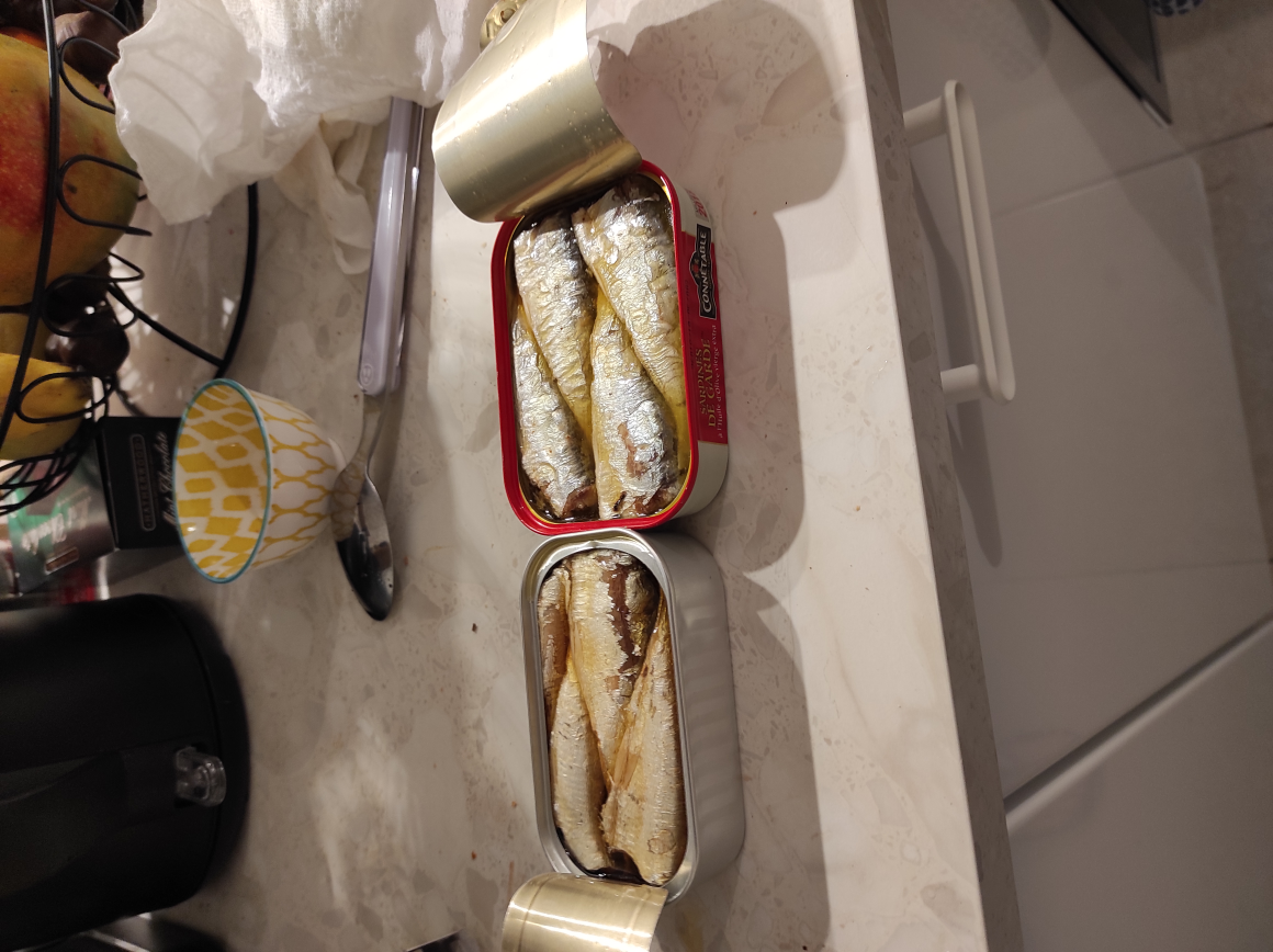 Je viens de manger des sardines les Doris à l'huile d'olive, c'est des marocaines mais bon c'est pas cher (1€/boite) et ça m'évite de toucher dans le stock