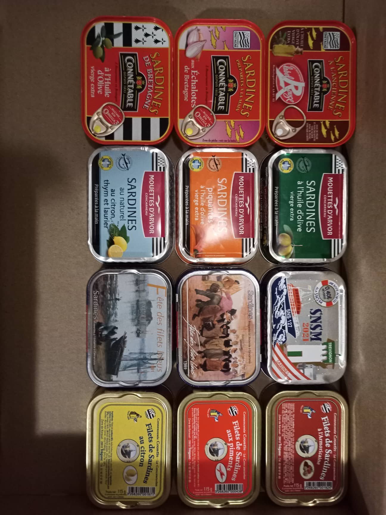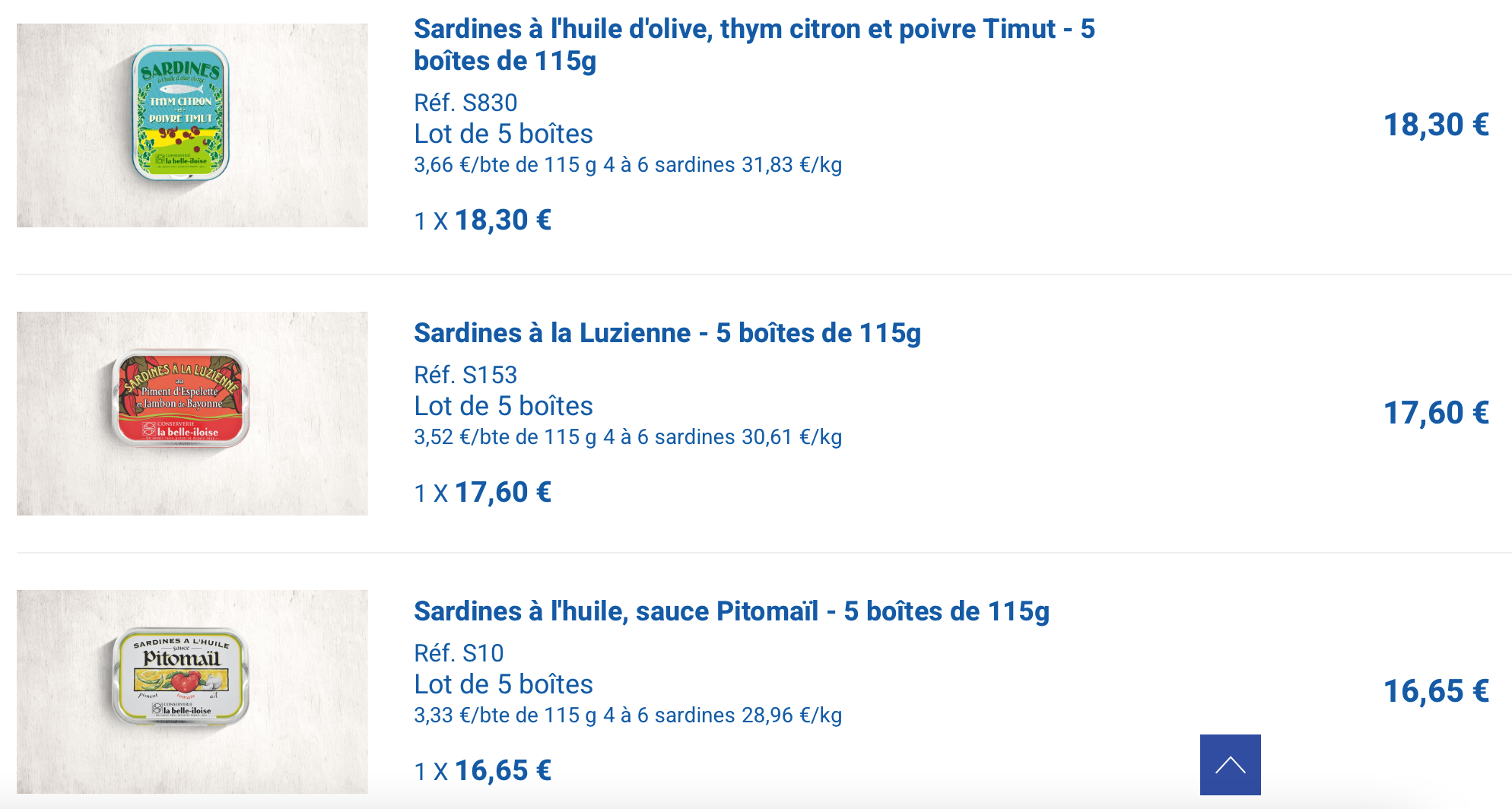 Celles en bas à gauche sur ta photo (boîte jaune) en filets j'ai goûté c'est infâme j'ai tout mis à la poubelle. J'ai pas testé les autres couleurs mais je présume que c'est la même qualité de poisson..