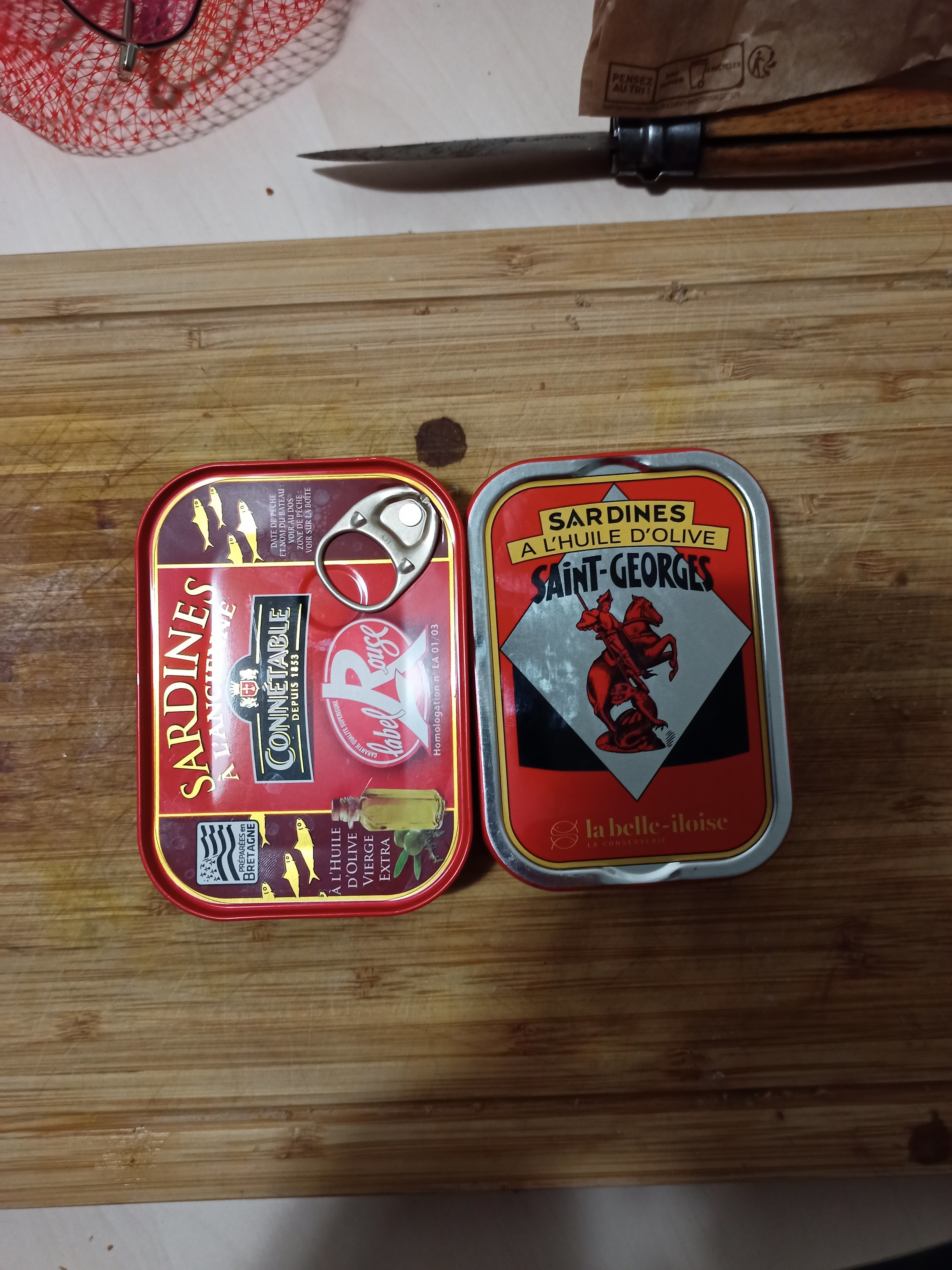 J'en ai quand même consommé et d'ailleurs j'ai testé pour la première fois les connetables ai piment d'Espelette. En fait j'étais étonné de voir sur Reddit que les gens semblaient apprécier les sardines avec du tabasco, je comprenais pas leur délire. Mais maintenant j'ai bien compris, c'est vraiment une bonne addition si bien dosé pour que ça relève juste le goût du poisson. J'ai aussi eu l'impression que l'arrête centrale était déjà plus tendre, j'ai pas vraiment fait attention aux dates sur la boîte donc je sais pas trop si elle était déjà un peu confie ou non. En tout cas je crois que c'est mon nouvel acmromate préféré pour aller avec la sardine