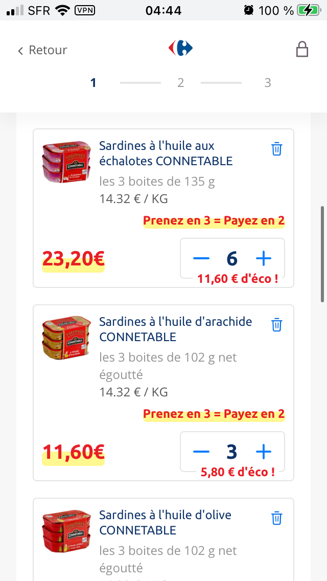 prix de base gonflé, avec la "promo", ça revient 1,93 la sardine, pas non plus l'affaire du siècle... pour quelques centimes de plus tu passes à la sardine de garde millésimée de saison.