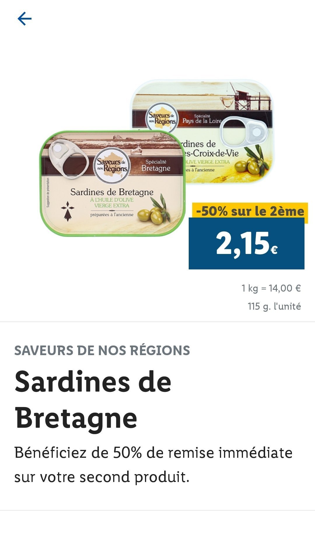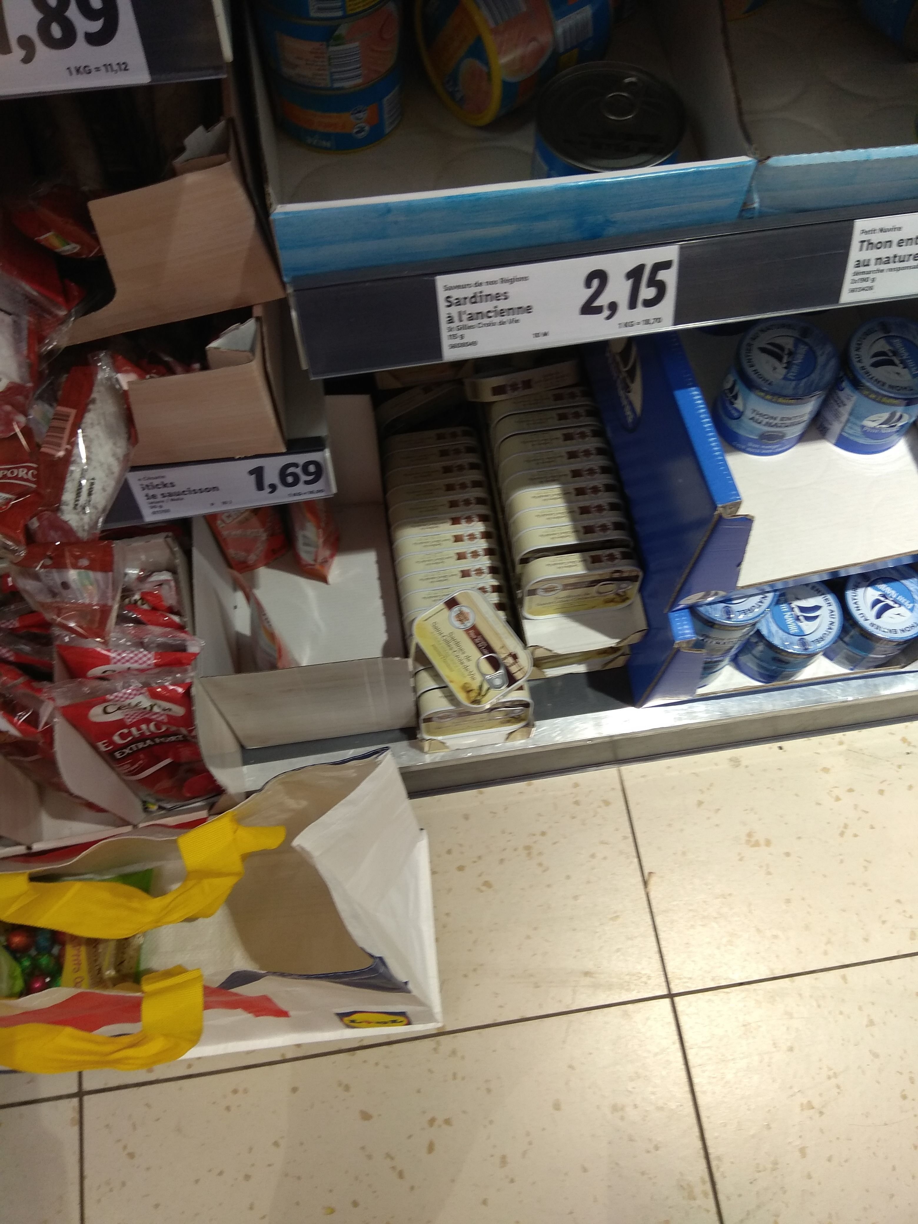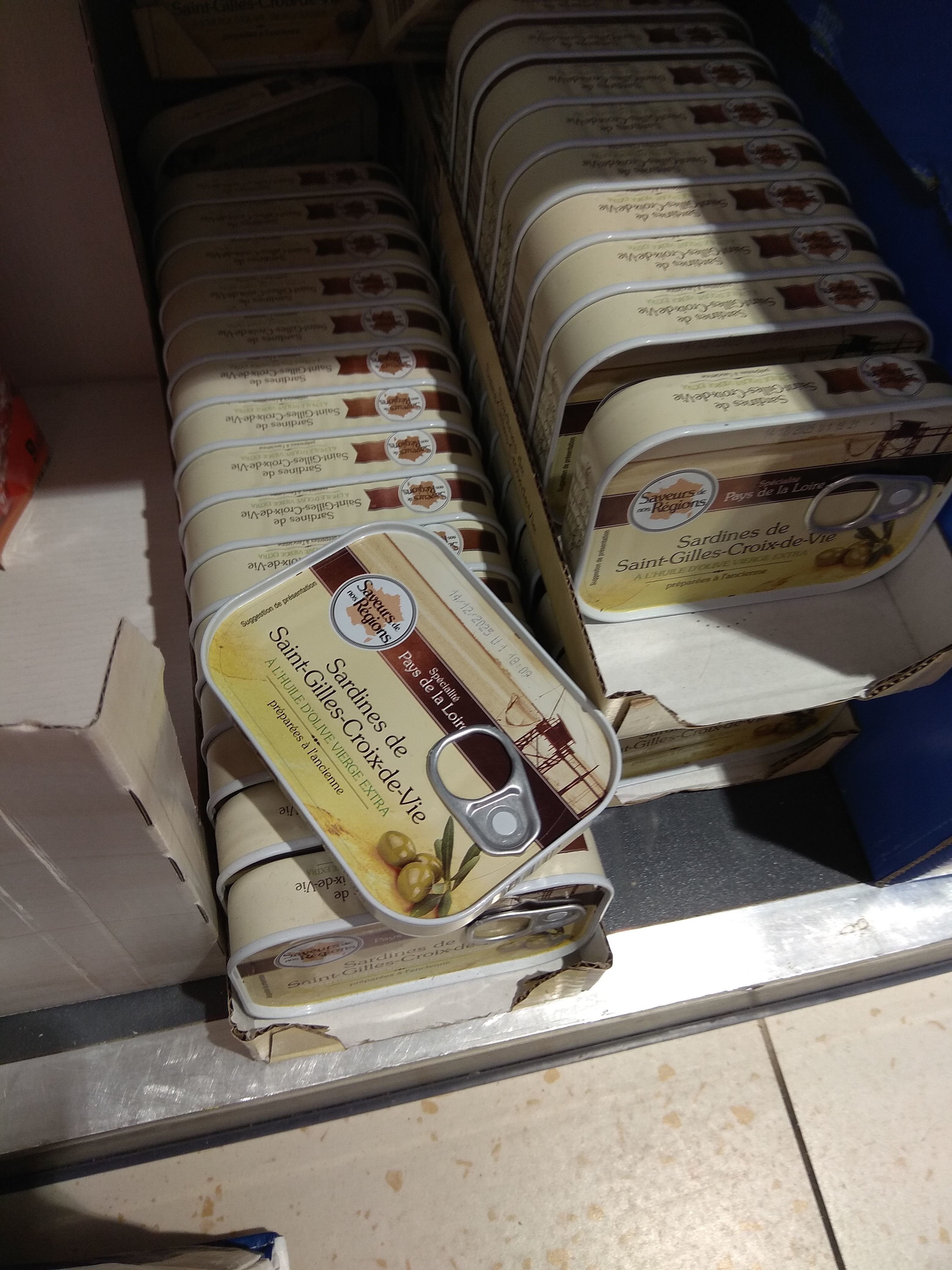 Faut prendre les cartons pour le passage en caisse ça donne du style. Quand j'achète les anchois Italiamo au LIDL que je trouve pas mal et à l'huile d'olive, je prends direct un ou deux cartons