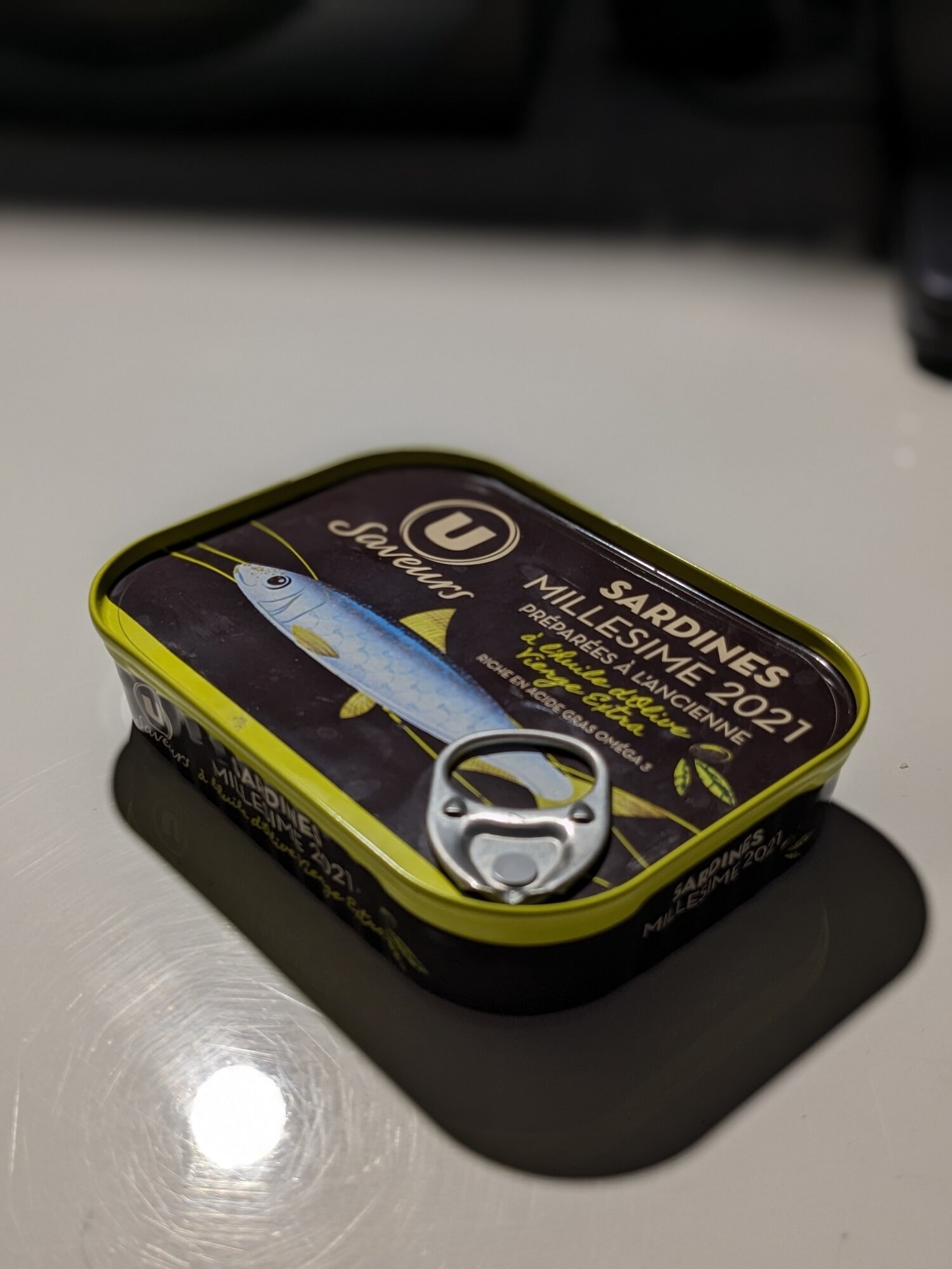 La boîte de sardines au pastis que j'ai acheté : Sardines 70%, huile d'olive vierge extra, pastis 5%, sel