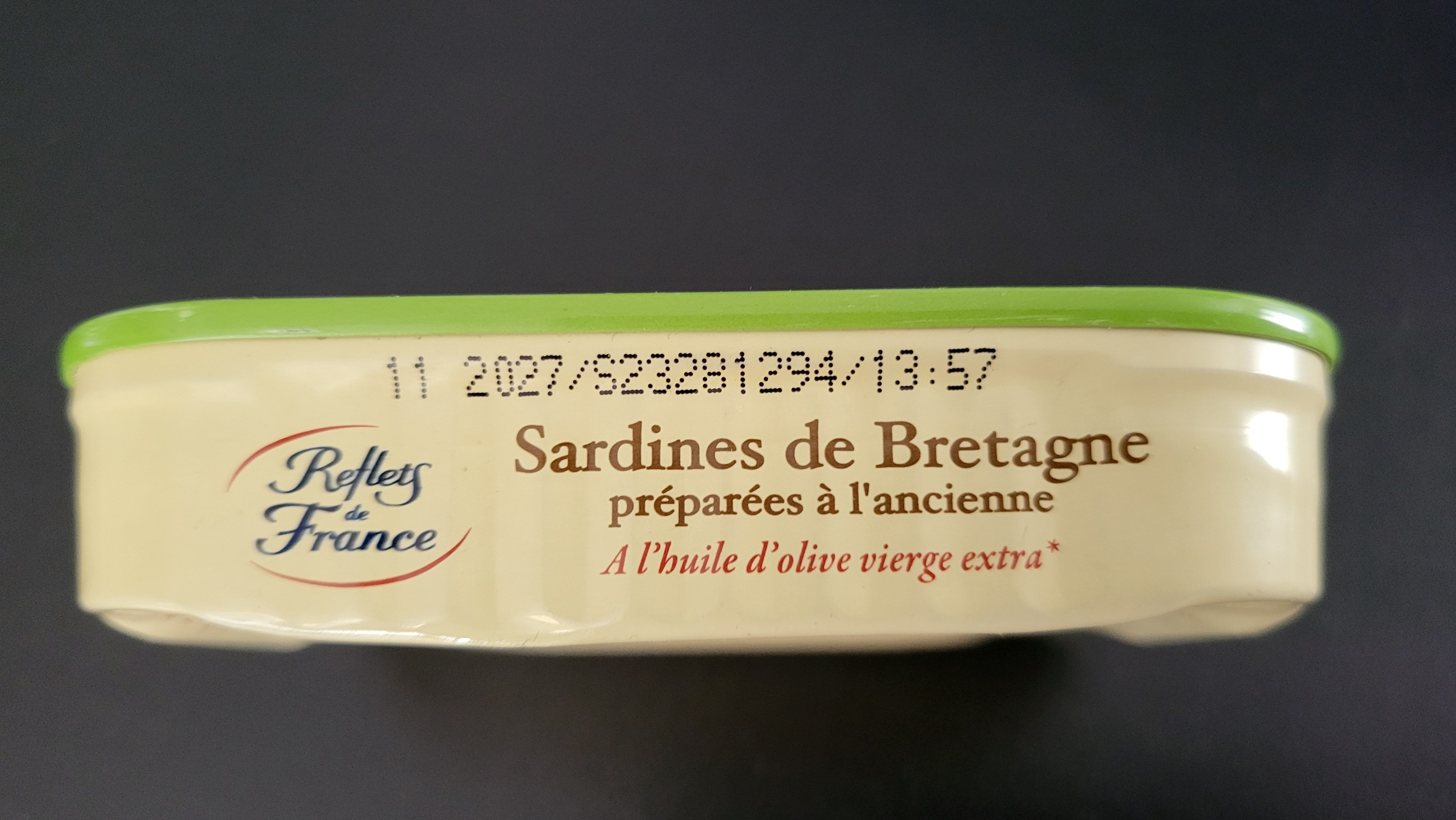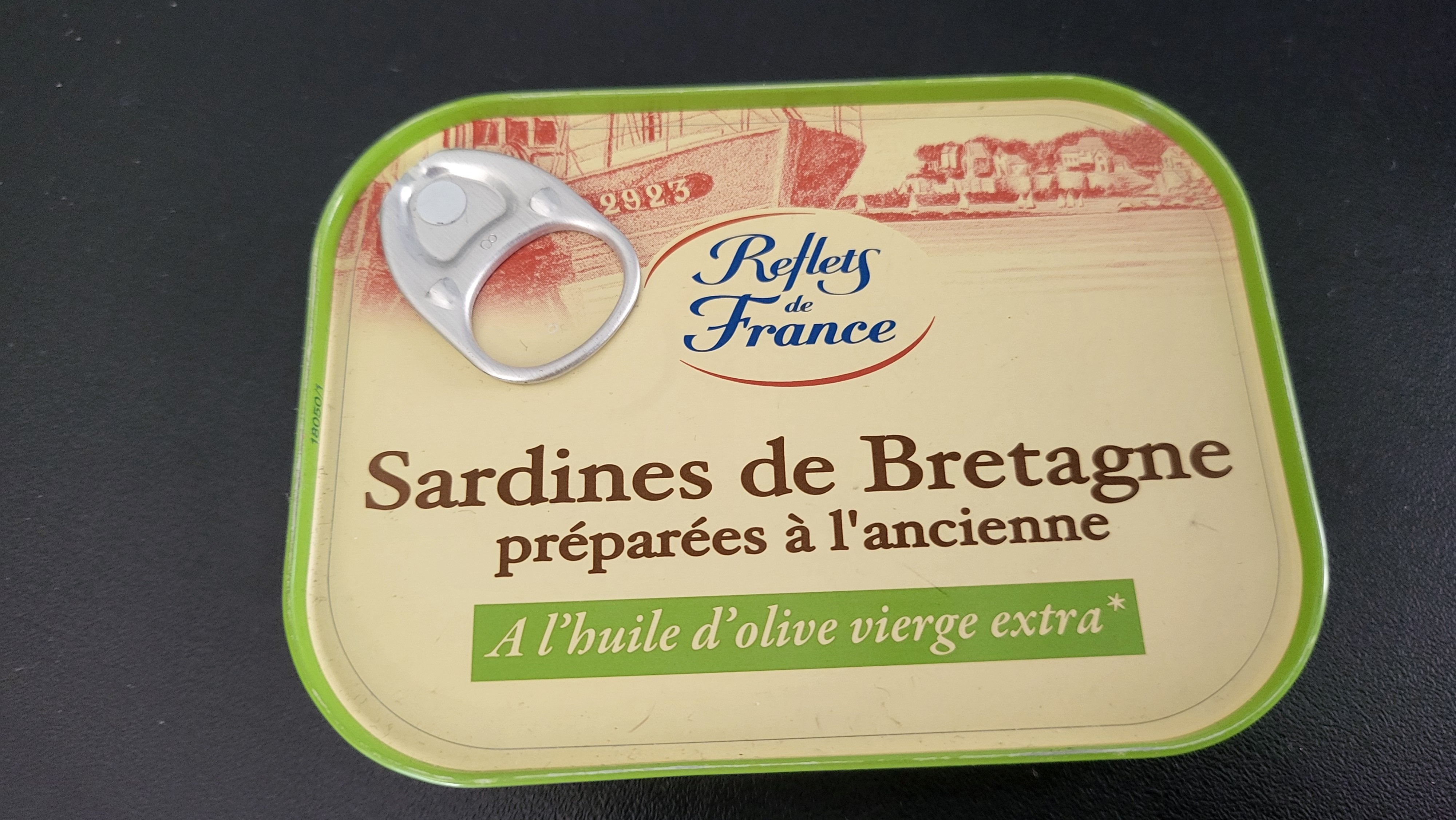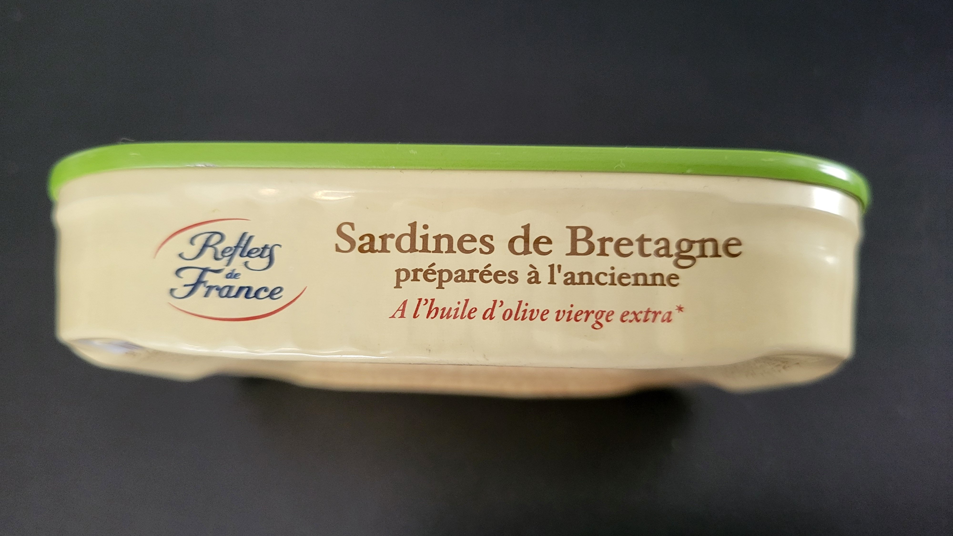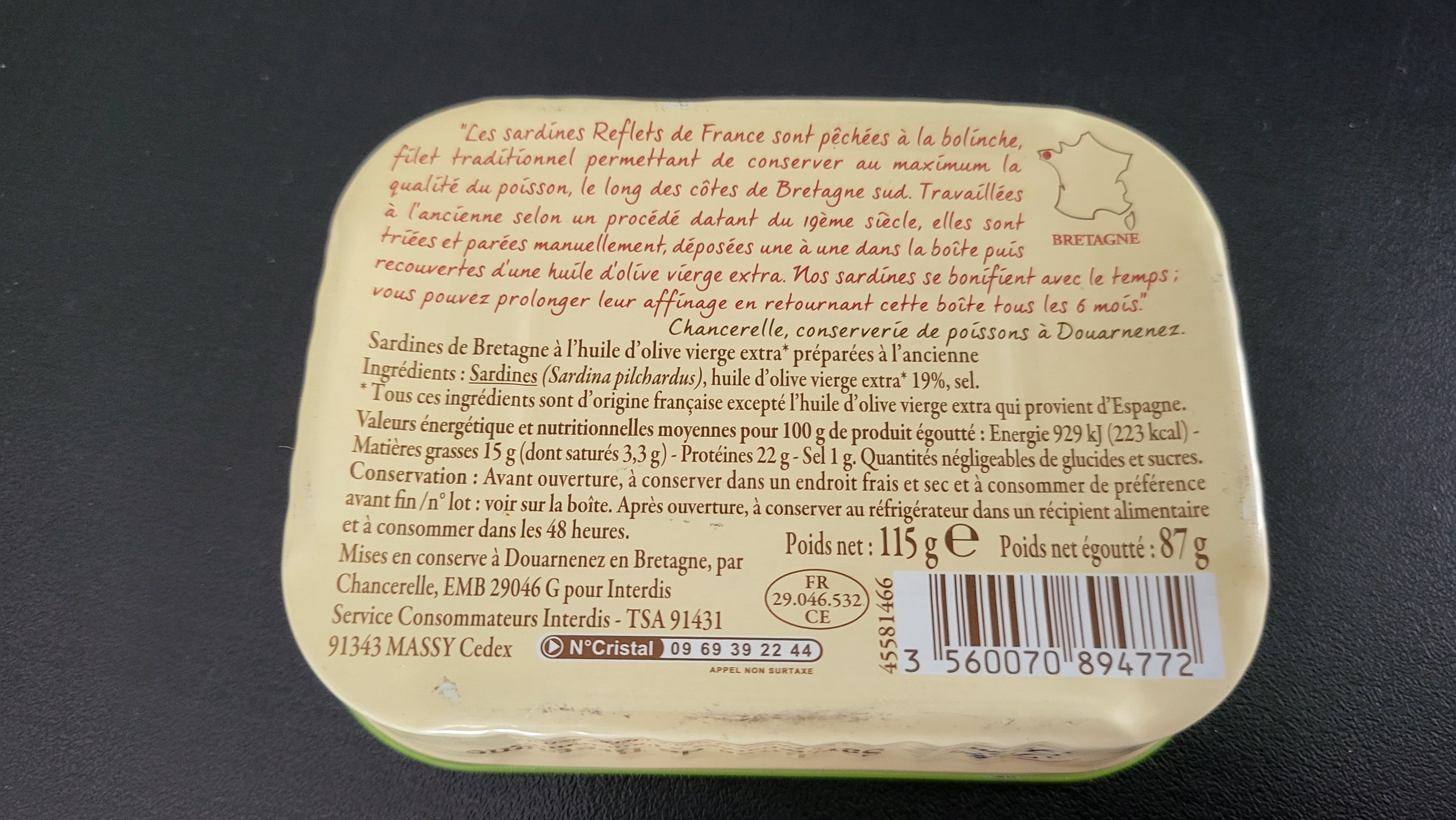 La : Sardines de Bretagne à l'huile d'olive extra vierge préparées à l'ancienne de chez reflets de France ,soit Chancerelle .