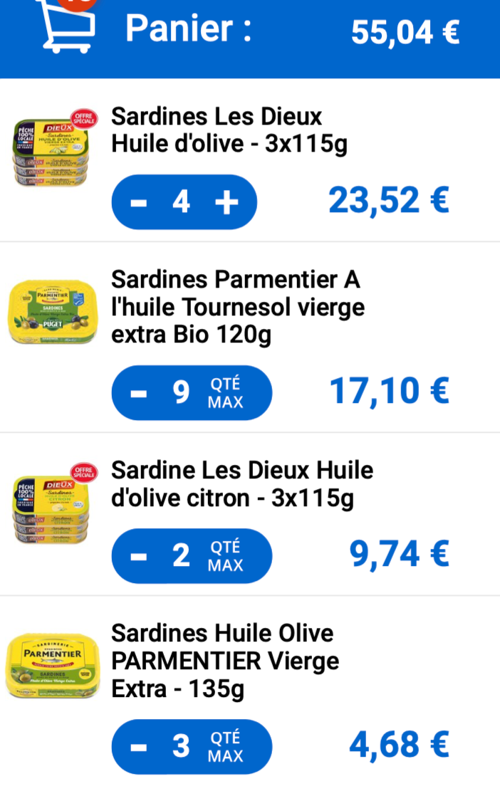 malheureusement y a plus que six boites donc je ne fais pas me déplacer, mais y a des ruptures de sardine en ce moment non ? partout où je vais le rayon est quasi vide !