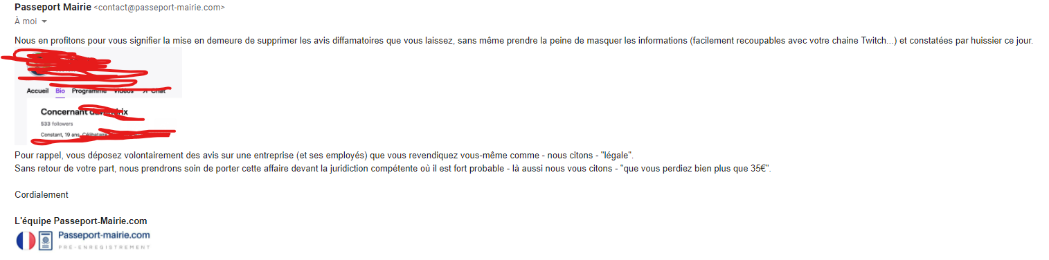 Ça n'a absolument aucun sens, ça pue l'escroc de bas-étage qui essaie de s'improviser jean-juriste. Comme si c'était interdit de déposer un avis négatif contre une entreprise "légale" jpp