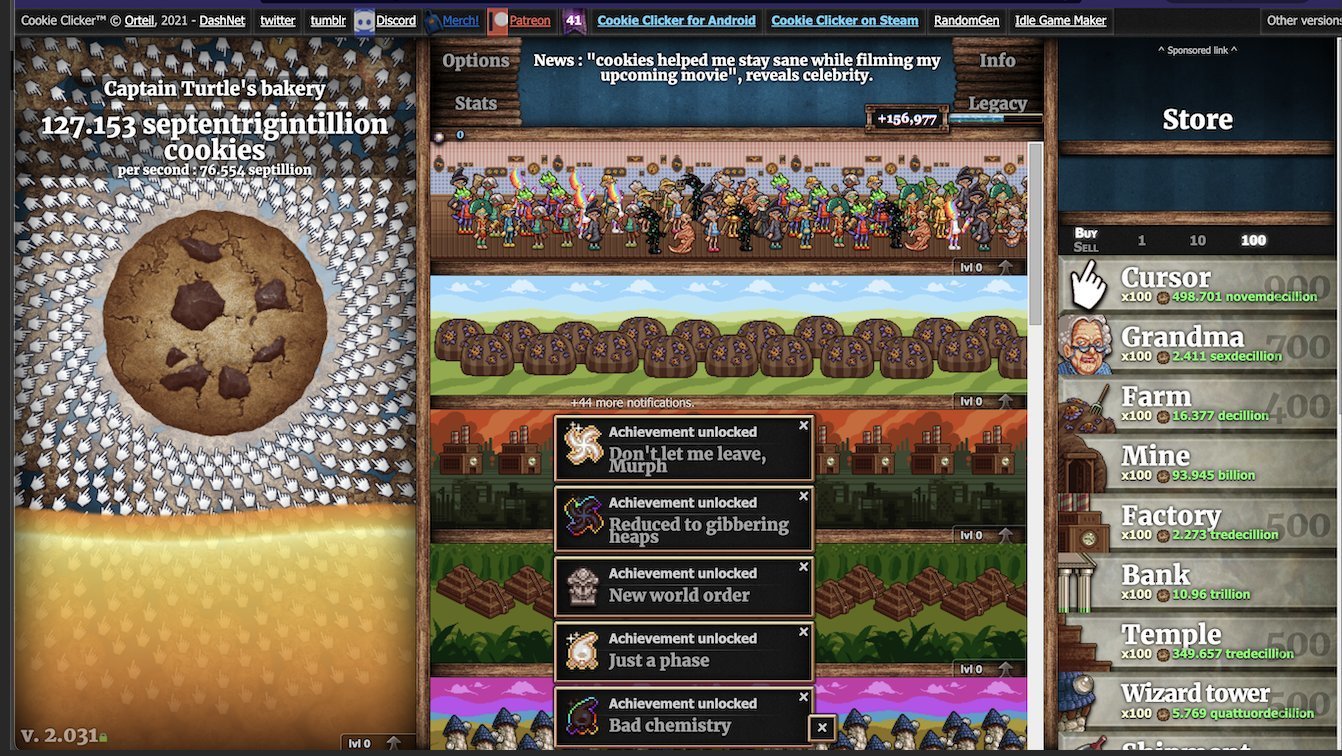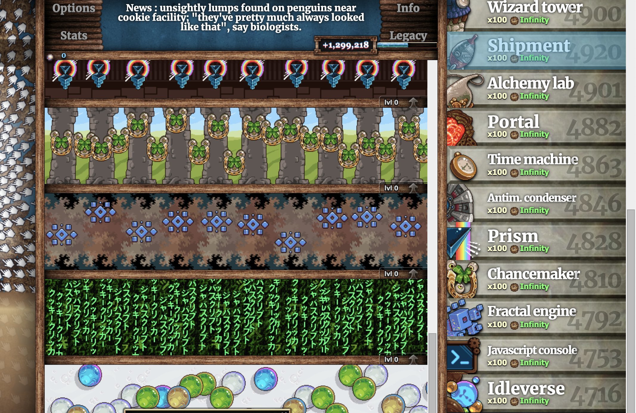 Et puis on attend , on économise pour acheter la prochaine amélioration qui va doubler la production. Mais on est pris dans la boucle , les trillions sont maintenant aussi long a gagner que nos premiers cookies.