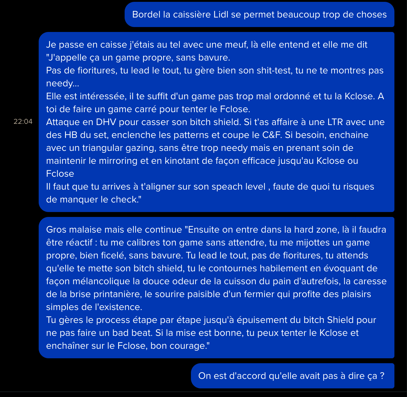 Le 31 octobre 2021 à 21:58:20 :Ahi le retour du khey qui redpill vergognless sur tinder