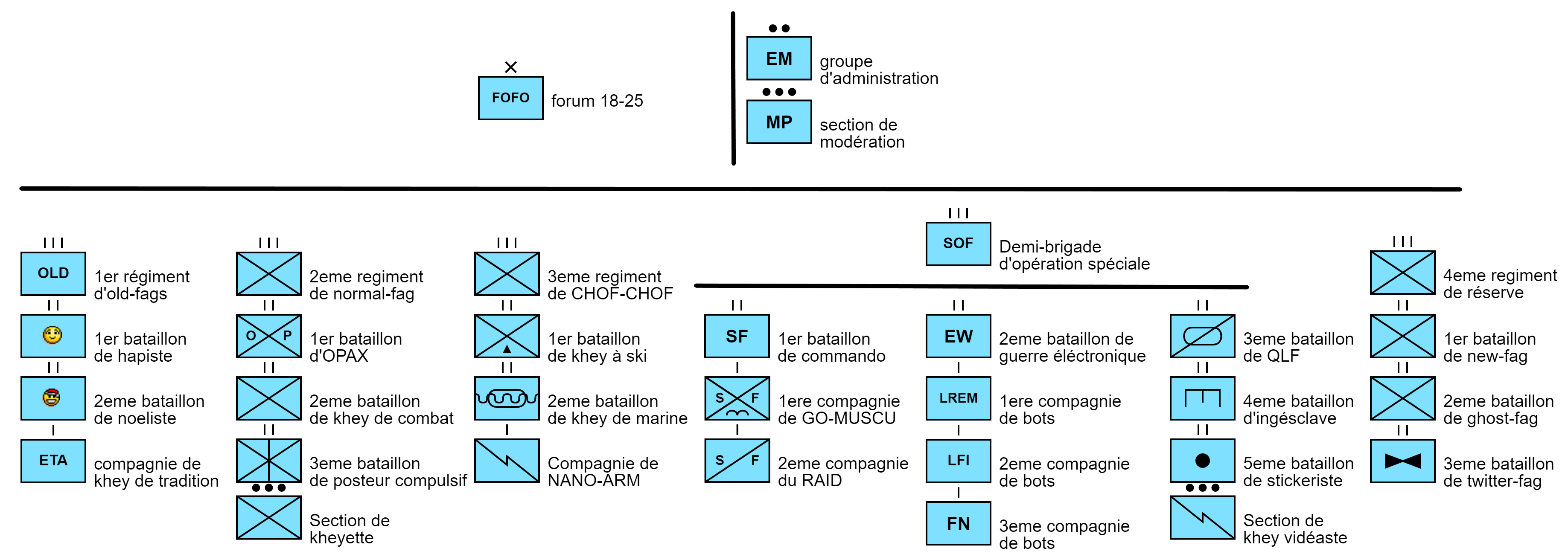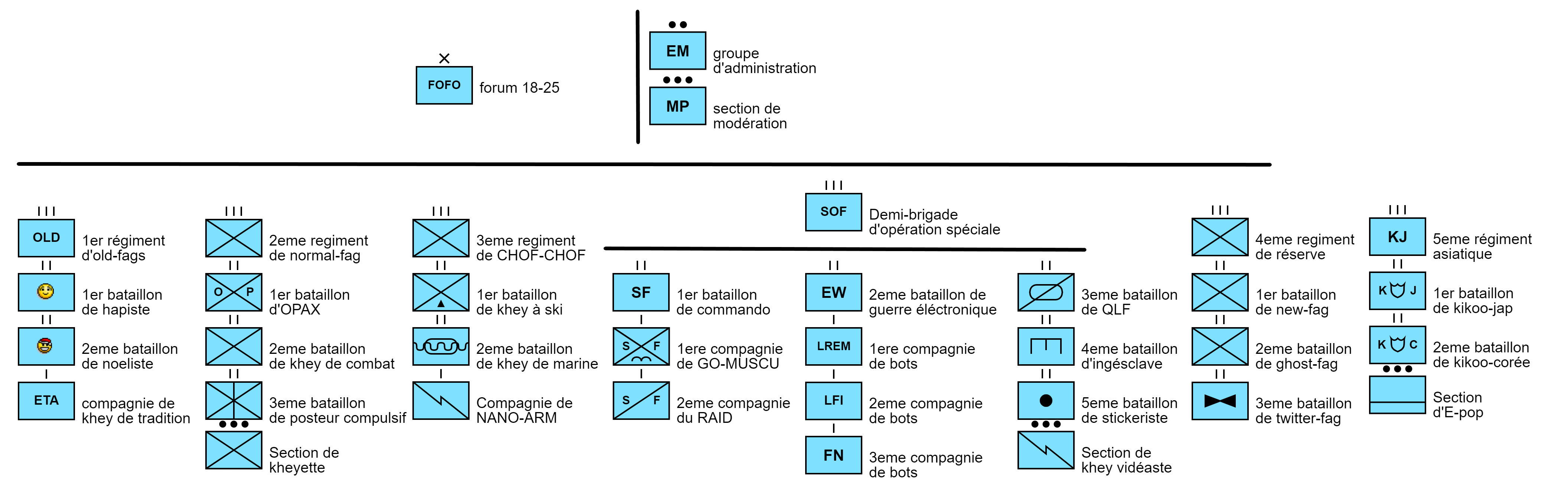 J'ai fais ca en amphi, l'organigramme officiel de la 18-25 eme brigade de la division du forum du corps JVC de l'armée de webedia
