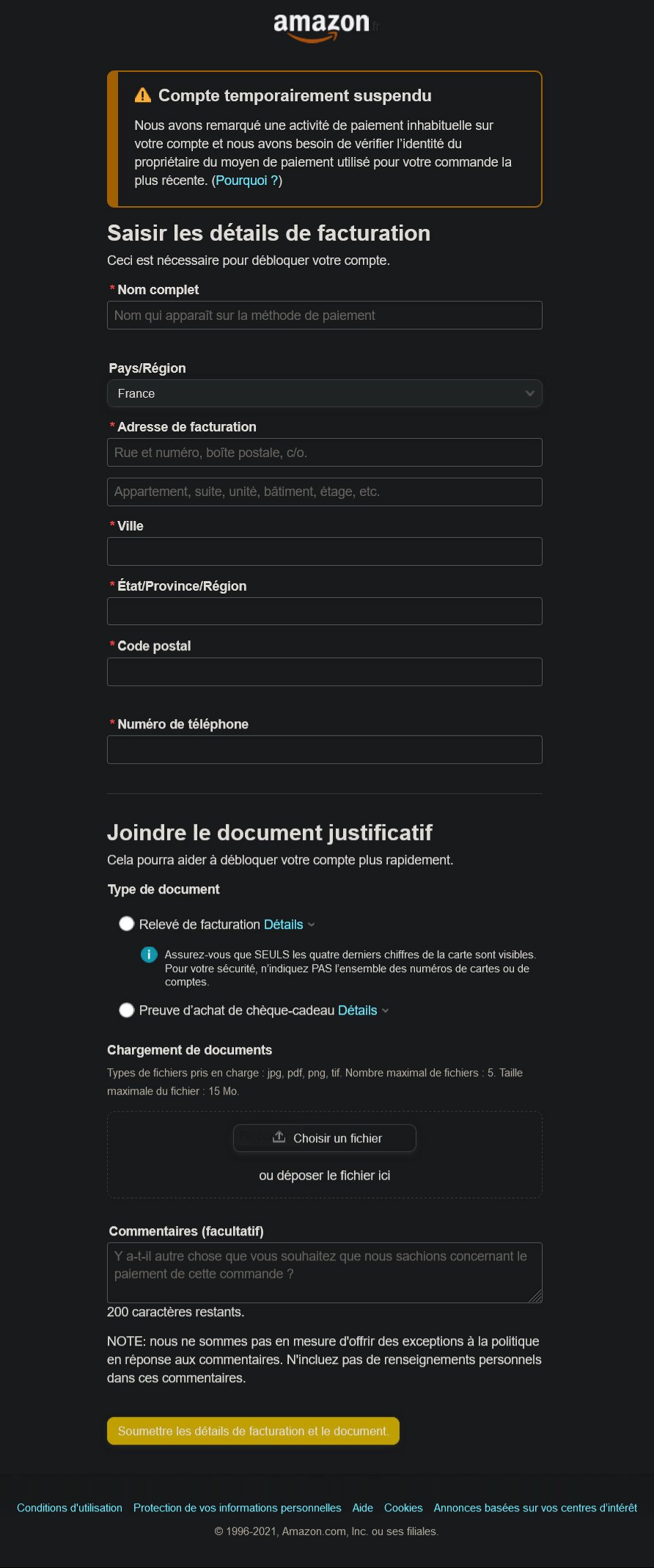 Mes livraisons en cour suspendus Impossible d'aller sûr prime vidéo j'ai appelé 4 fois on me dit qu'on va m'envoyer un mail et je reçois rien j'ai même appelé amazon UK avec mon Anglais oral de merde parce que j'ai lu qu'il étaient plus compétents Je tombe sur des topics de forums où des personnes ont le compte bloqué depuis plusieurs mois, rassurant Tout ça parce que j'ai ajouté ma nouvelle carte bancaire parce que l’ancienne à expiré et que le bot a trouvé ça suspect