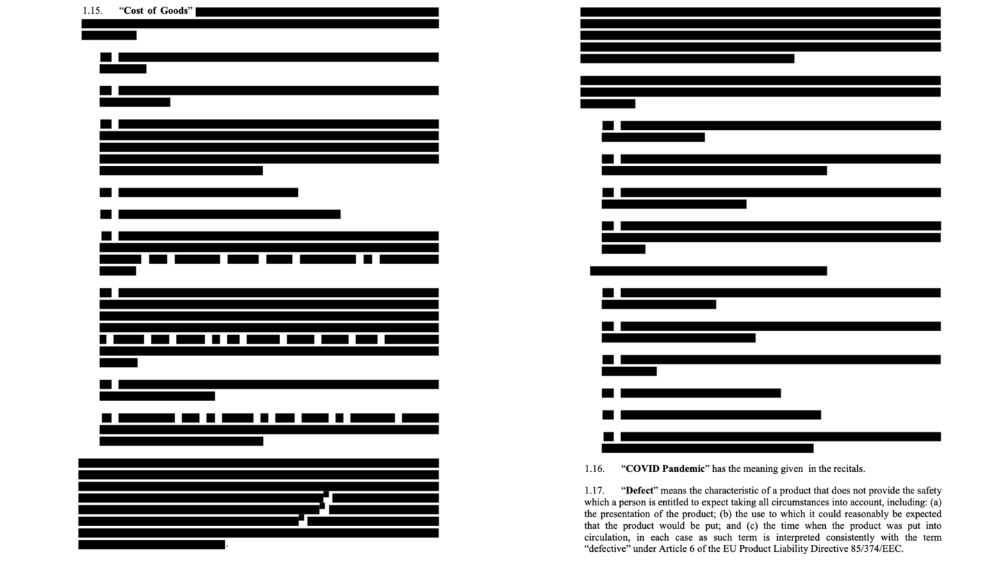 Vous pouvez comparer à l'original censuré dispo sur le portail de l'ue avec la censure https://ec.europa.eu/info/sites/default/files/redacted_advance_purchase_agreement_biontech-pfizer_0.pdf