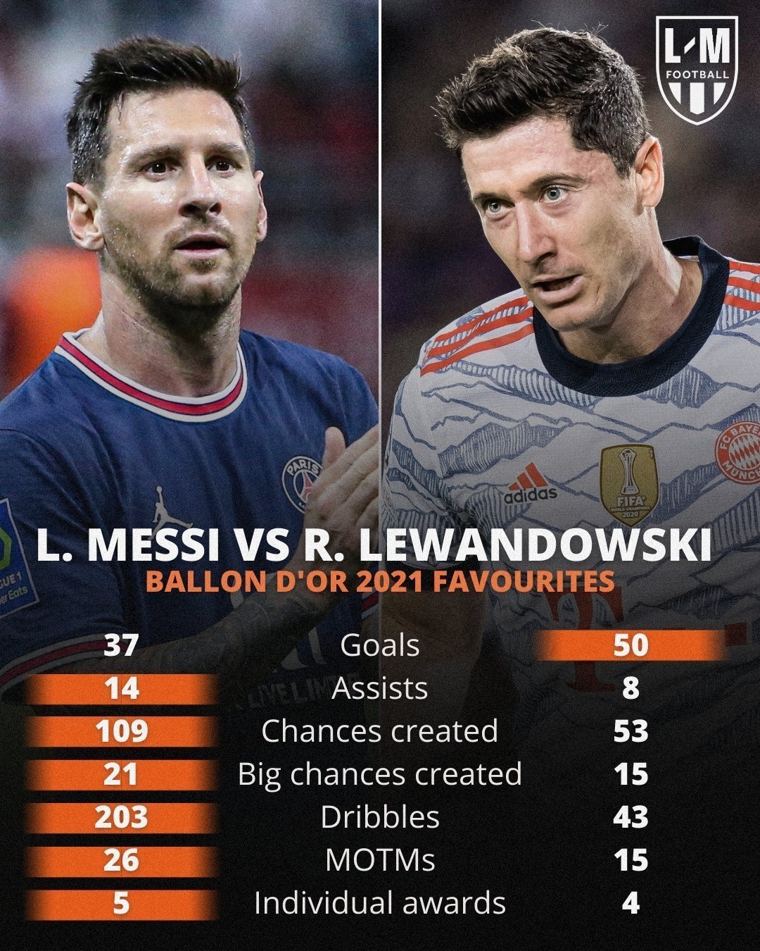 Pour les amateurs et connaisseurs du ballon Rond, Robert Lewandowski le mérite 100 fois + mais comme souvent la plupart des votent proviennent de pays qui n'y connaissent rien en foot (Afrique, Asie etc ...) et donc ça favorisera le plus célèbre des deux (comme ce fût le cas y a 2 ans avec sa victoire polémique de 7 points sur Van Dijk grâce aux pays du tiers-monde)