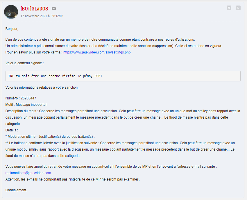 Mec c'est pas la première fois que ça m'arrive, j'ai boosté une ddb pour pédopornographie et j'ai reçu un message de glados la salope en me disant que le message correspondait à la charte, alors que CLAIREMENT c'était une allusion pédophile, j'en reviens pas
