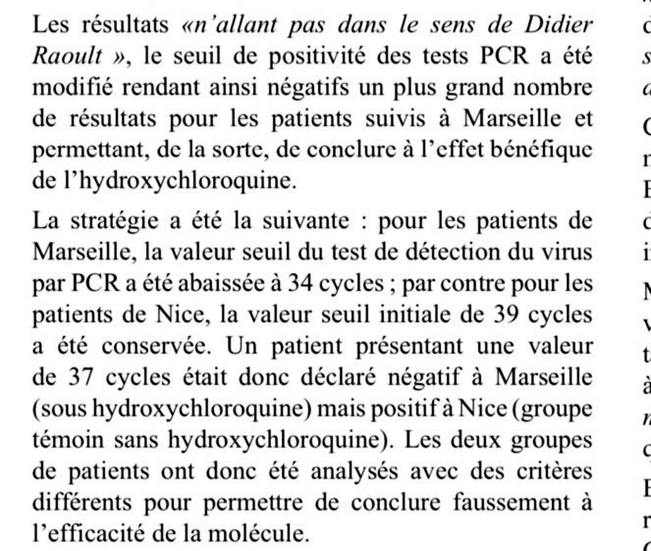 " Un patient présentant une valeur de 37 cycles était donc déclaré négatif a Marseille (sous hydroxychloroquine) mais positif a Nice (groupe témoin sans hydroxychloroquine). Les deux groupes de patients ont donc éte analysés avec des critéres differents pour permettre de conclure faussement a l’efficacité de la molécule."