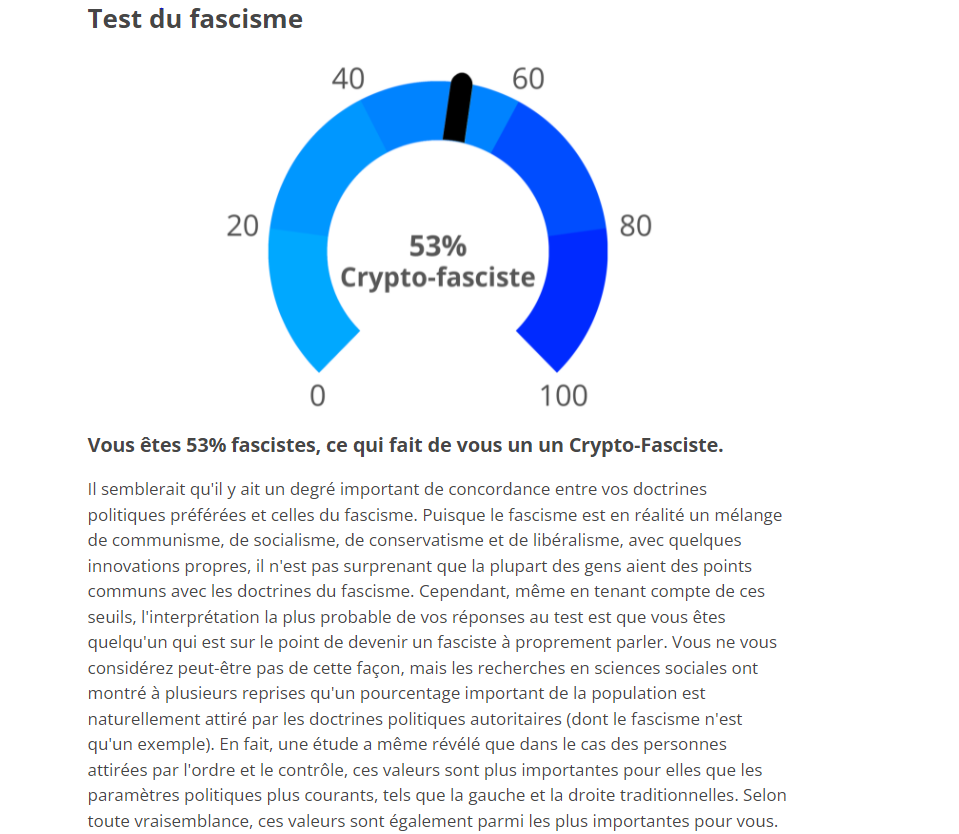 Il semblerait qu'il y ait un degré important de concordance entre vos doctrines politiques préférées et celles du fascisme. Puisque le fascisme est en réalité un mélange de communisme, de socialisme, de conservatisme et de libéralisme, avec quelques innovations propres, il n'est pas surprenant que la plupart des gens aient des points communs avec les doctrines du fascisme. Cependant, même en tenant compte de ces seuils, l'interprétation la plus probable de vos réponses au test est que vous êtes quelqu'un qui est sur le point de devenir un fasciste à proprement parler. Vous ne vous considérez peut-être pas de cette façon, mais les recherches en sciences sociales ont montré à plusieurs reprises qu'un pourcentage important de la population est naturellement attiré par les doctrines politiques autoritaires (dont le fascisme n'est qu'un exemple). En fait, une étude a même révélé que dans le cas des personnes attirées par l'ordre et le contrôle, ces valeurs sont plus importantes pour elles que les paramètres politiques plus courants, tels que la gauche et la droite traditionnelles. Selon toute vraisemblance, ces valeurs sont également parmi les plus importantes pour vous.