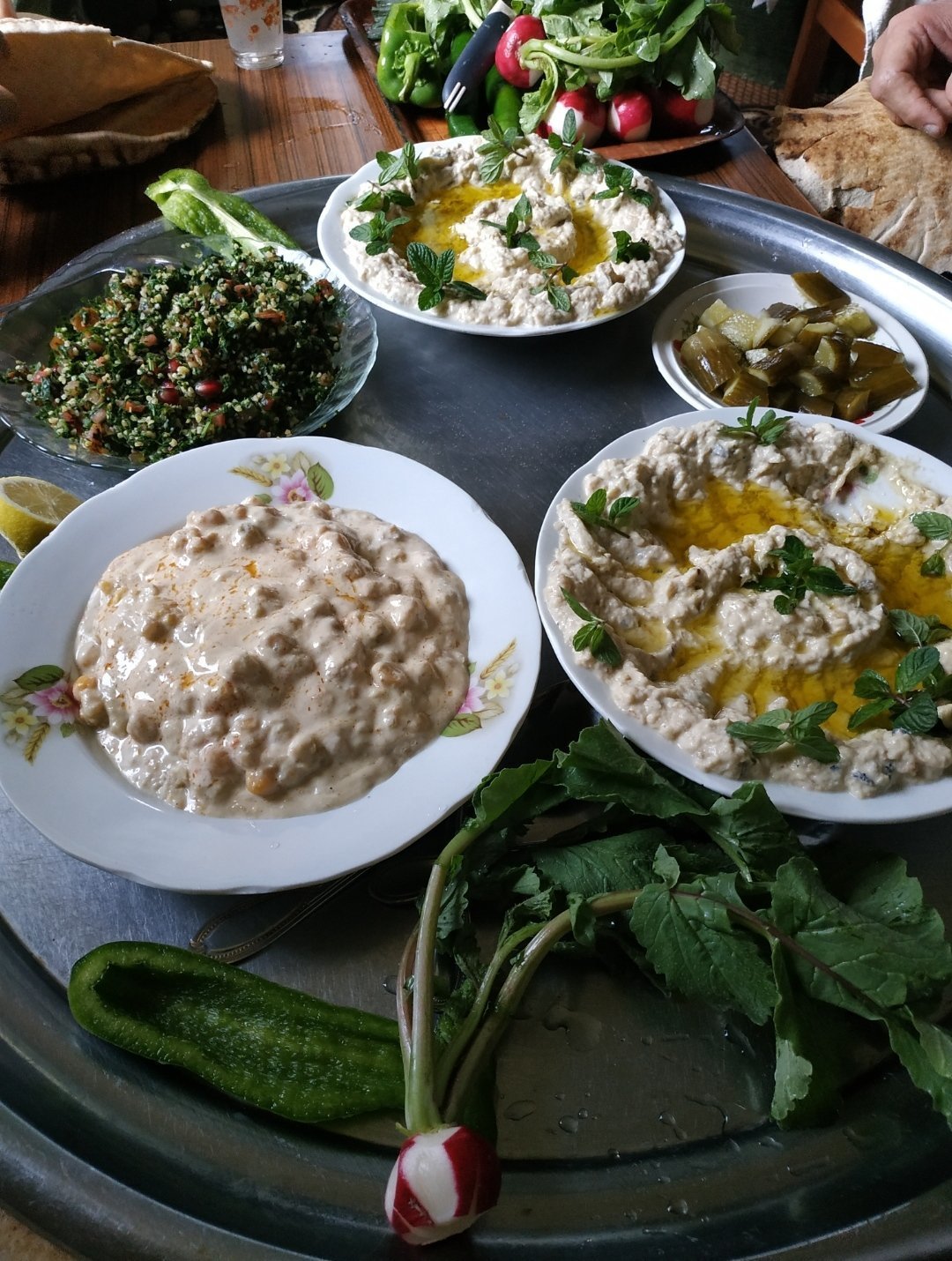 Taboulé, houmous, et mtabbal (aubergines grillées au barbecue et broyées avec de la tahina, creme de sésame, et huile d'olive)