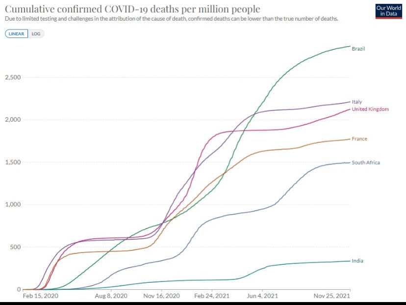 Les pires variants, et j’en avais parlé ici plusieurs fois, ont été ceux du Brésil qui a connu un taux de mortalité de près de 3000 personnes par million, là où les variants indiens, par exemple, ont été bien plus cléments, l’Inde étant en réalité beaucoup moins touchée.
