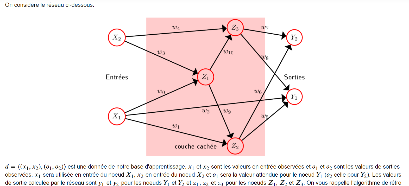 Le neurone Z1 prend comme input ce que X1 et X2 lui envoient, à savoir x1*w0+x2*w3, donc il va envoyer à Z2 la valeur w9*(x1w0+x2w3).