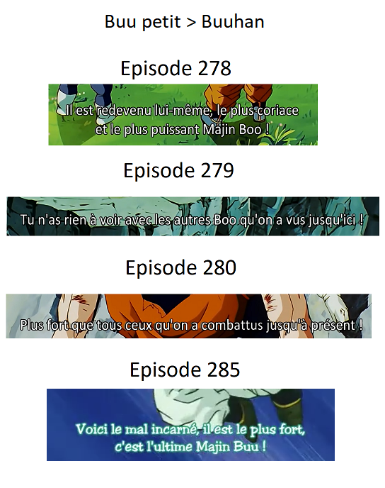 les feats et la logique montrent complètement que Kid Buu avec la prestation qu’il a eu dans son combat contre Goku ne peut pas être plus fort que Buuhan qui est à ce moment là infiniment plus fort que Goku.