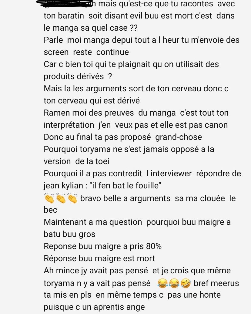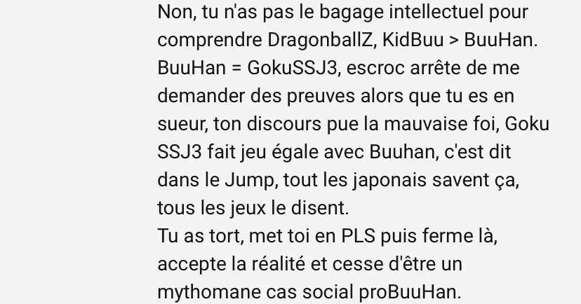 -Si vous voulez une méthode simple pour mettre les pro Kid Buu en PLS, demandez leur une preuve tiré du manga DB qui prouve que Kid Buu>Buuhan. Vous les verrez pâlir, grincer des dents et bégayer